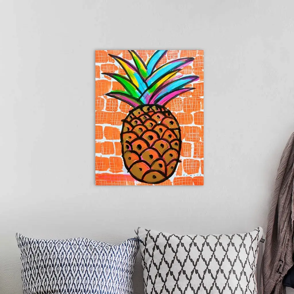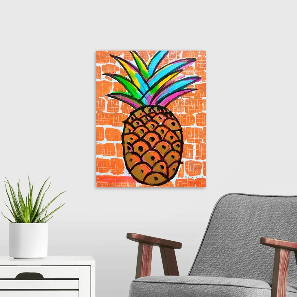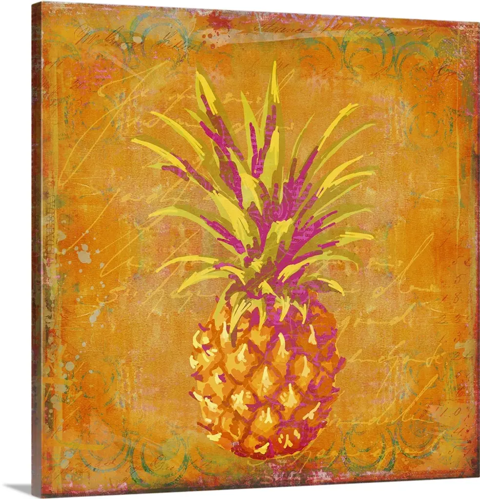 Pineapple painted gold and black with a rainbow burst of colors on the leaves on an orange background.