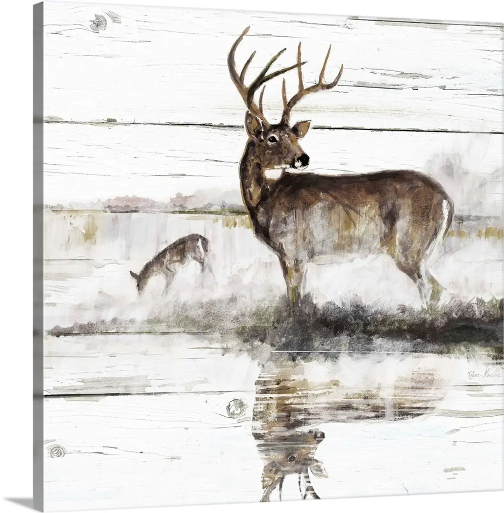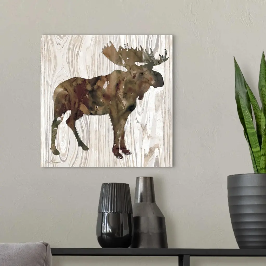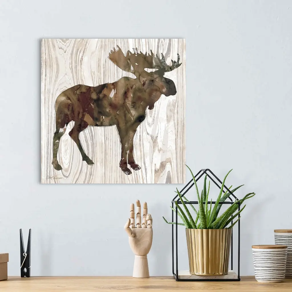 Watercolor silhouette of a moose on a wood-grain pattern.