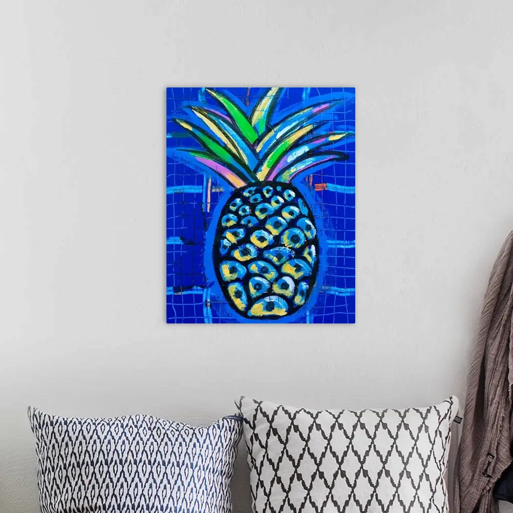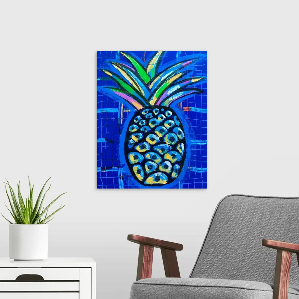 Pineapple painted in vibrant multi-colors on a midnight blue background.