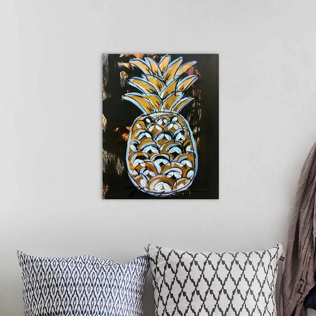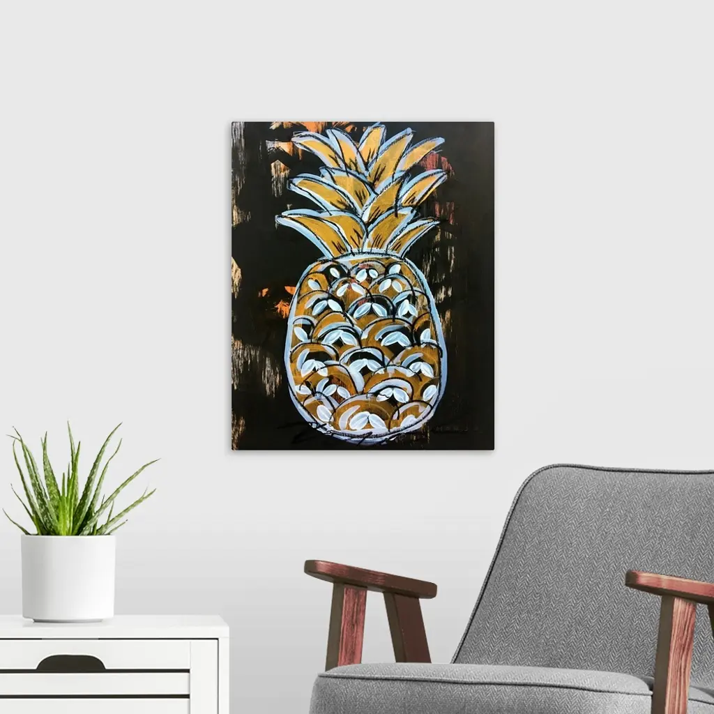 Pineapple painted in an expressionistic style, in white and gold, on a black brushed background.