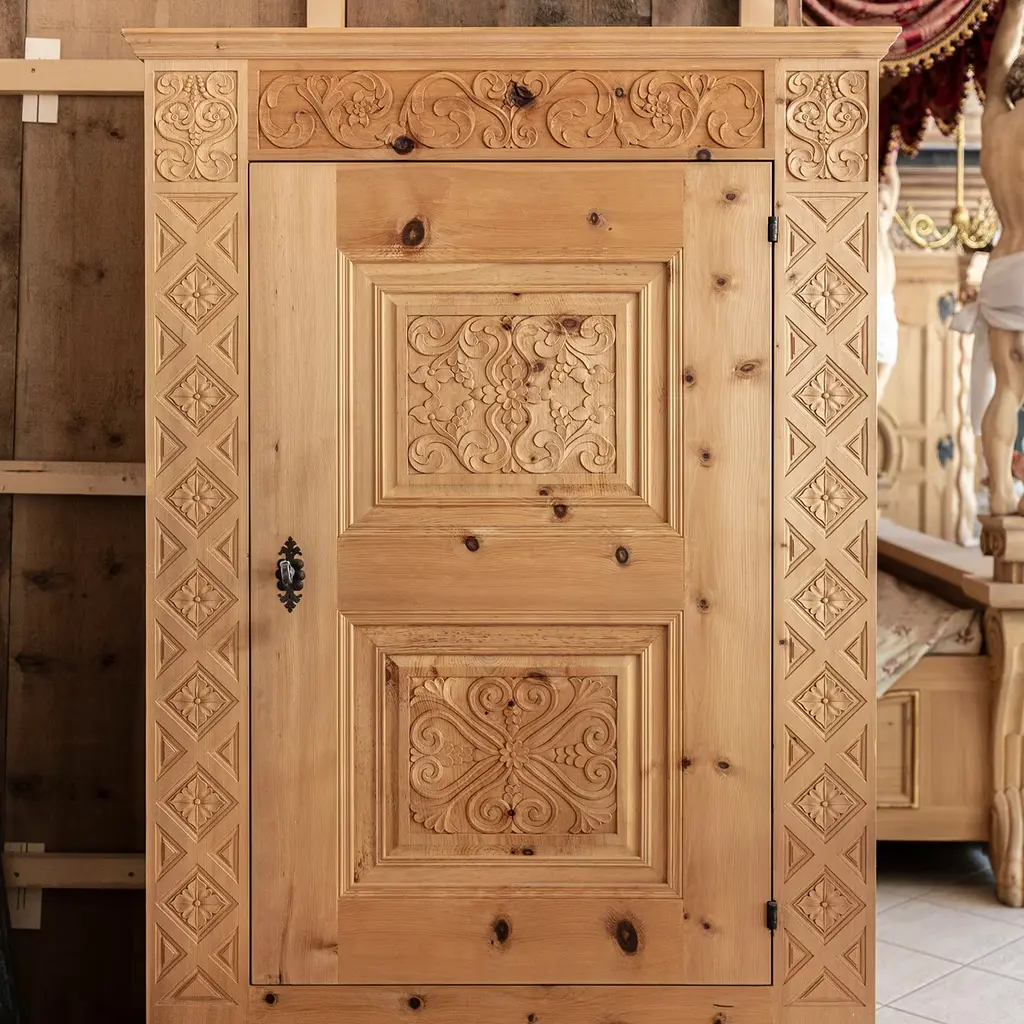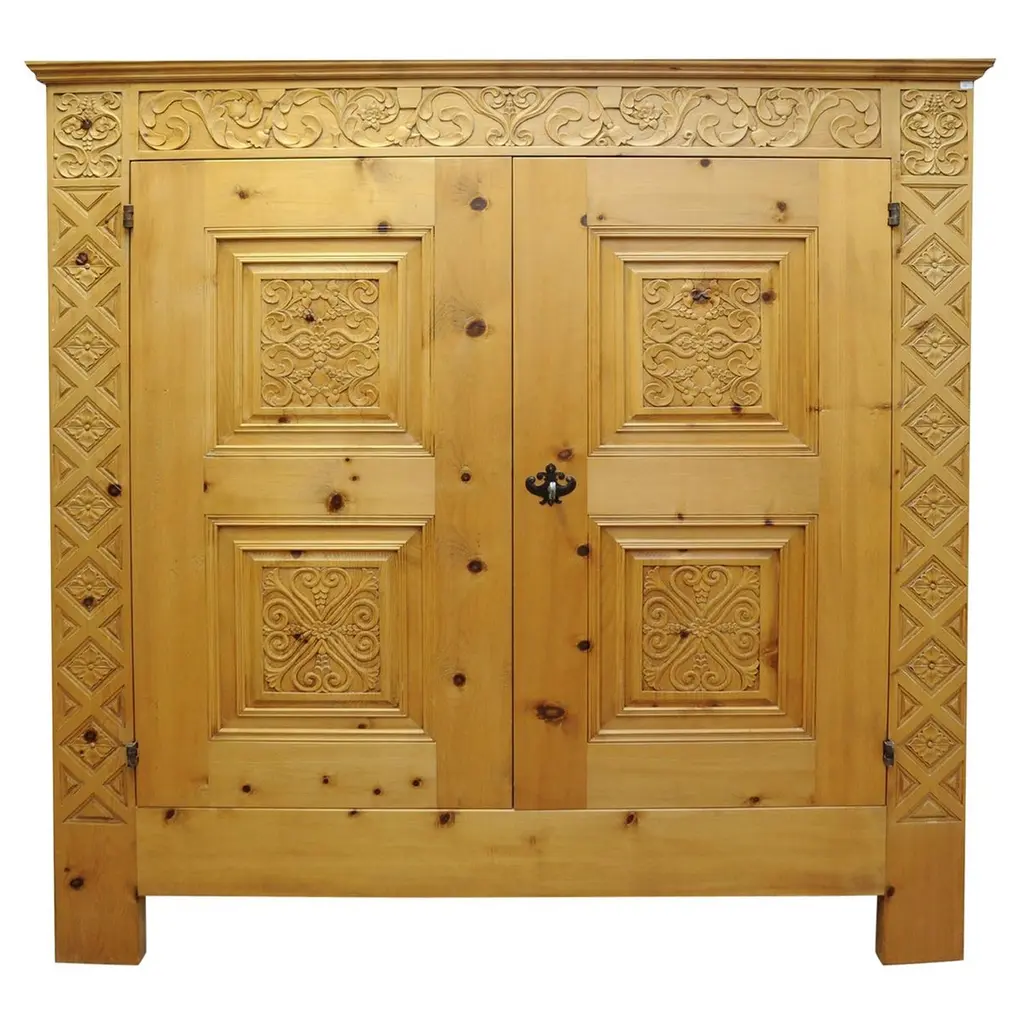 A stunning, dual ornamental-functional piece for an entryway or bedroom decor, this closet is entirely handcrafted of solid pinewood, spectacularly carved by hand in gorgeously detailed decorations of traditional sophistication. Featuring only a single central door, it opens to reveal a practical coat rod for hanging coats, clothes, and other accessories.