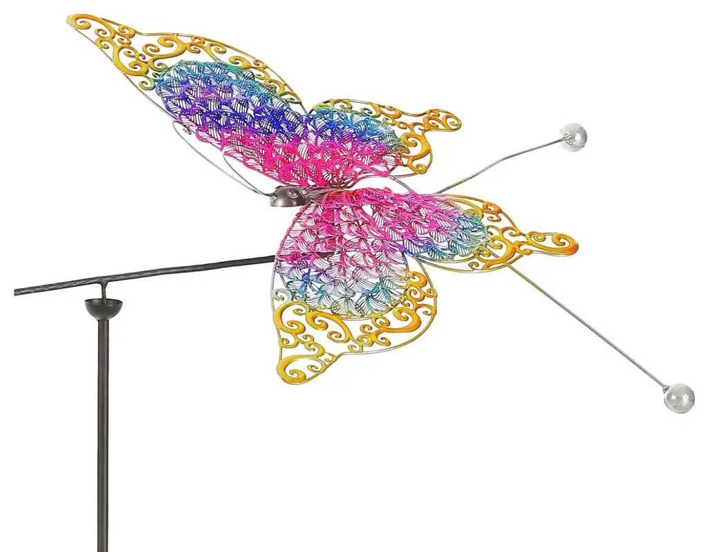 Brightly colored butterfly wings with intricate see-through leaf shaped patterns on the inner wings and swirling lines on the outer edges. The wind will spin the butterfly and the counter weight ball rocks up and down allowing the wings to flap.