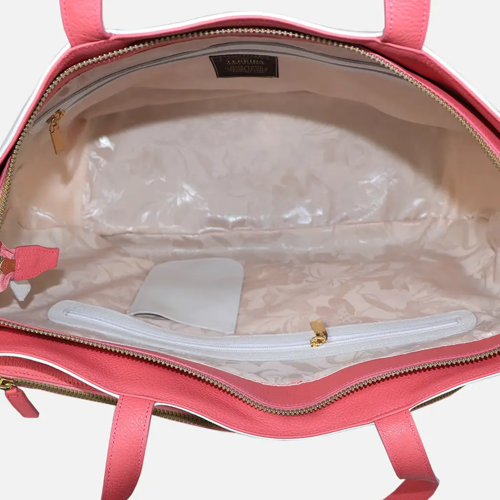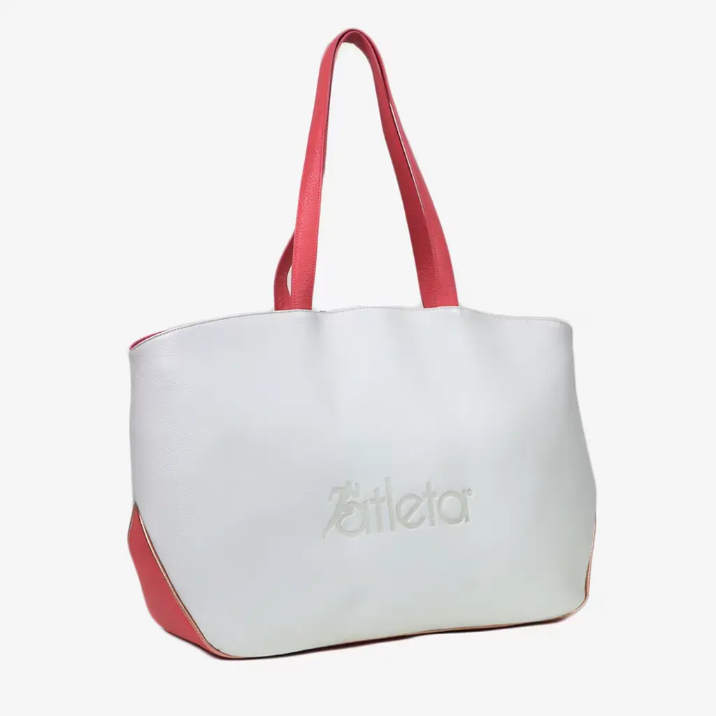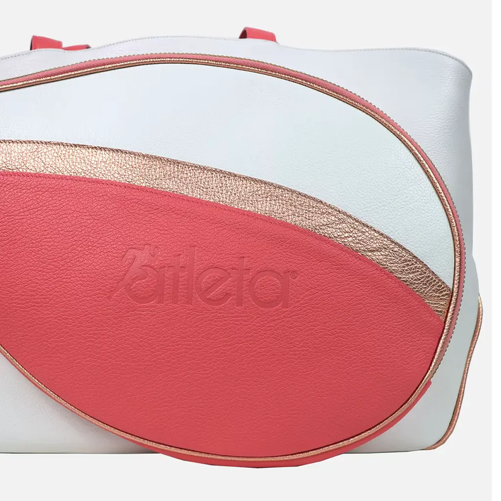 A stunning ergonomic design, this sports shopper combines functionality and aesthetics. Handmade in real, waterproof leather, it features a combination of white, pink, and bronze shades enhancing its elegant yet sporty character. It features a large inner pocket and a tennis racket external pocket, adjustable handles, and an optional shoulder strap upon choice. Customizable upon request, please ask the Concierge for options.