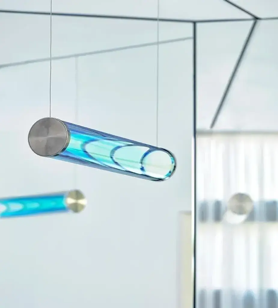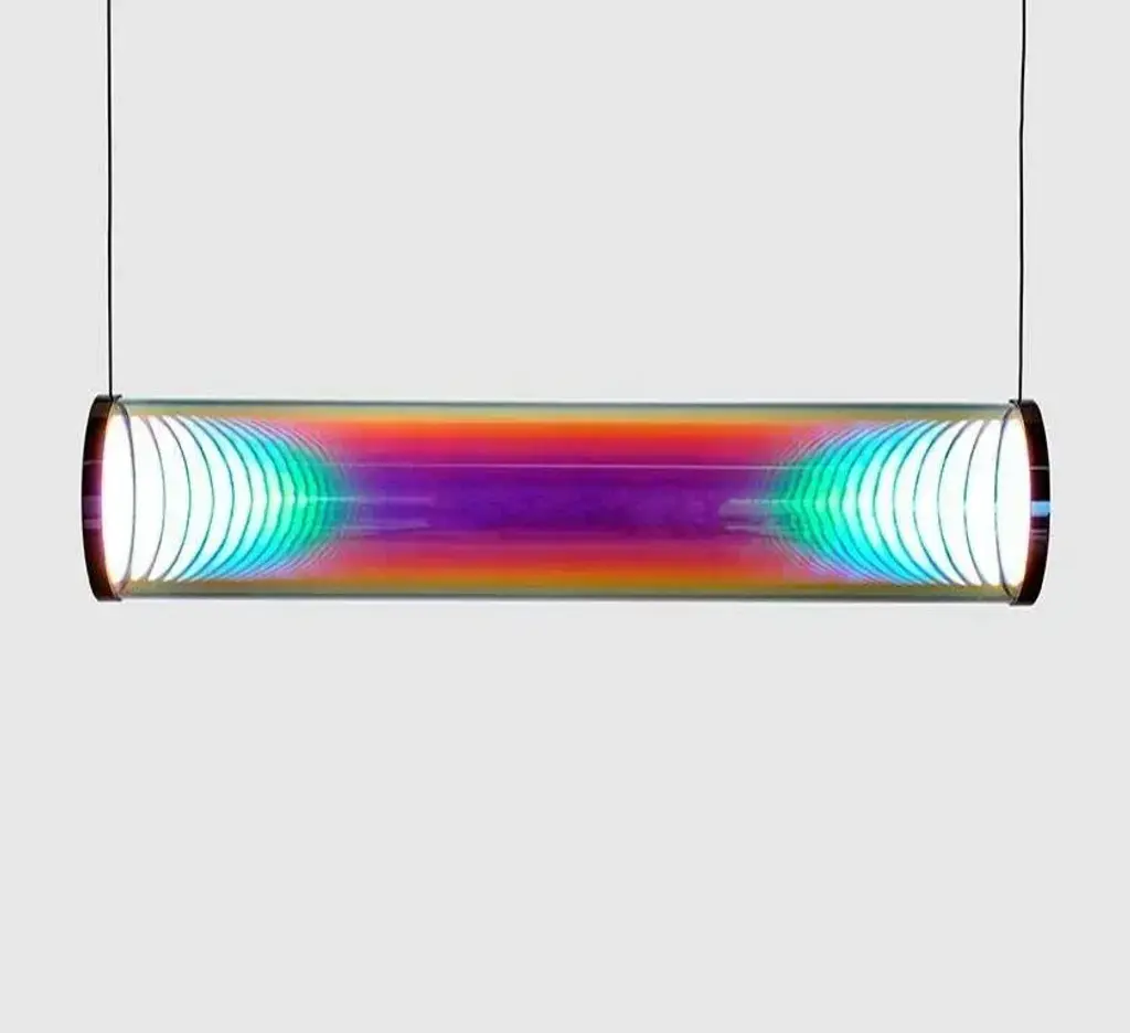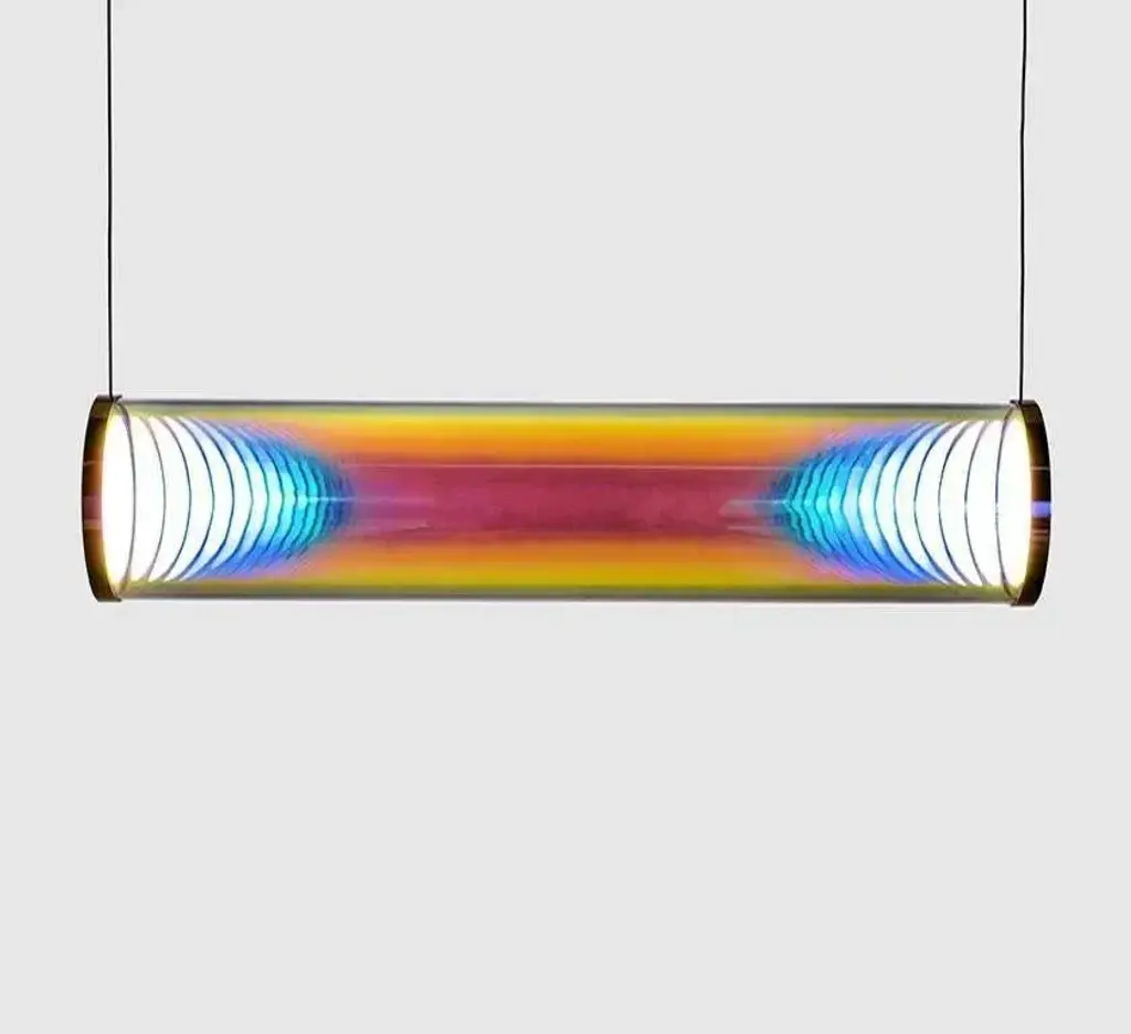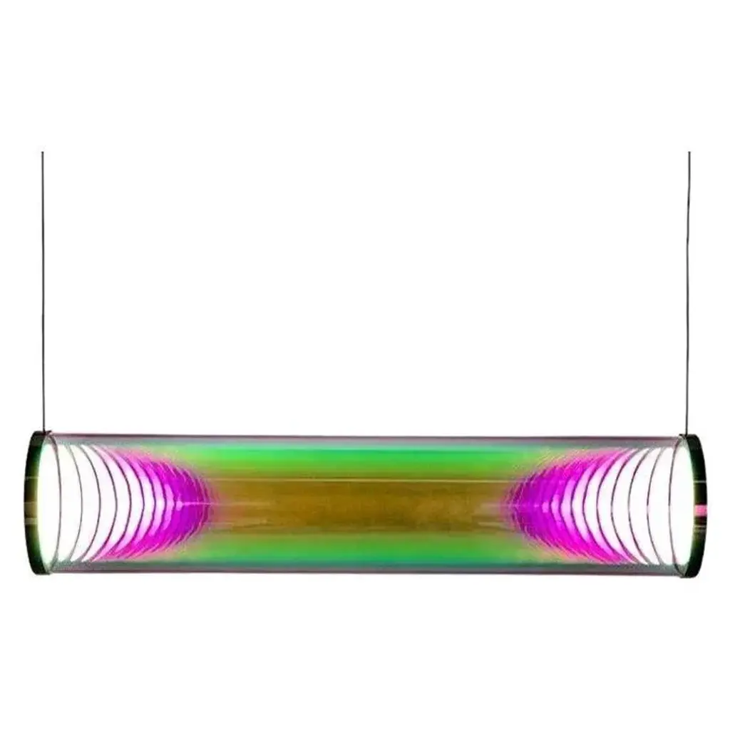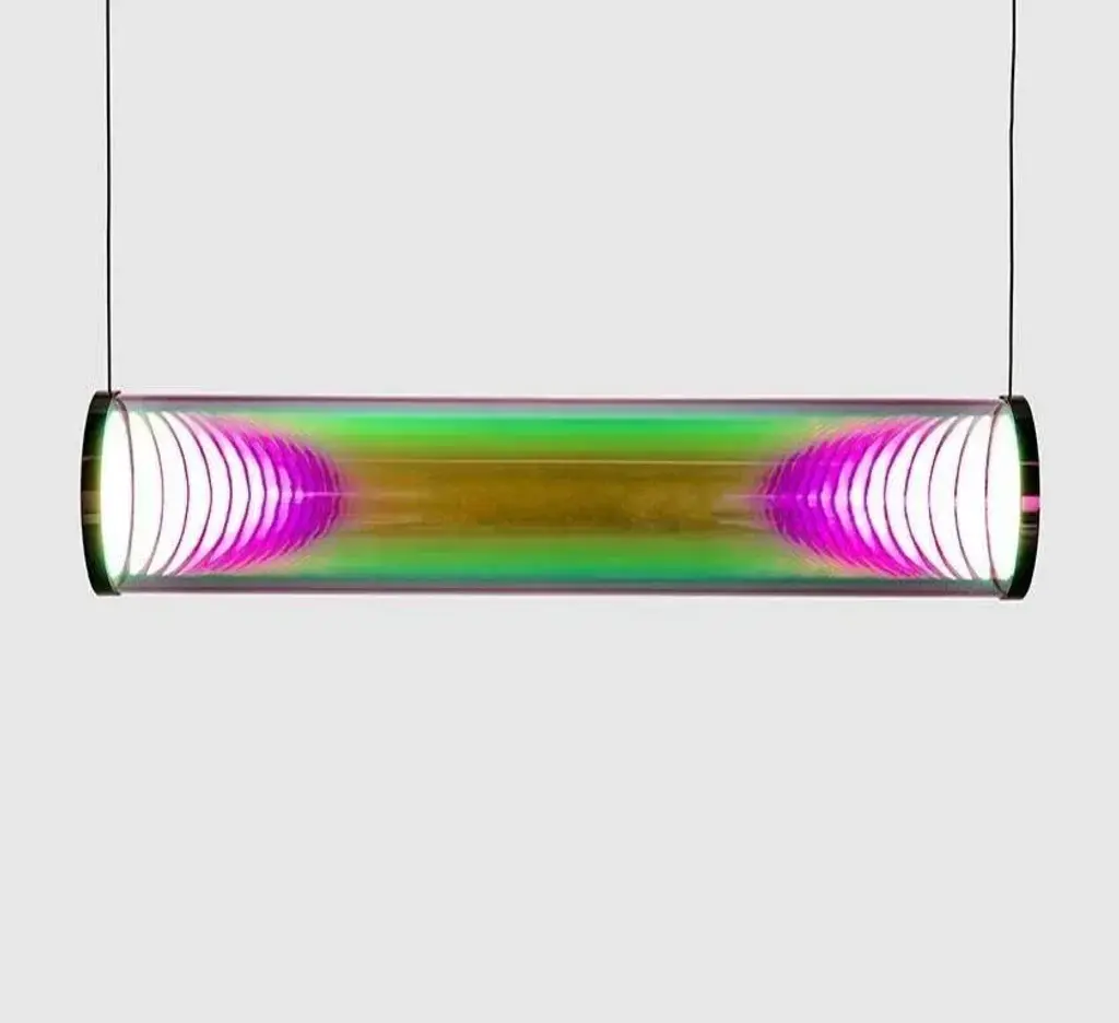 Pink-green iris tube by sebastian scherer material: crystal glass, mirror stainless steel dimensions: l 70 cm x ø 12 cm also available in mirror brass colour: pink-green also available in gold-indigo, cyan-magenta, blue-orange, silver-grey traditional glass production in the oldest glassworks of germany the iris tube pendant lamp is the consistent implementation of the iris globe luminaire as an elongated tube luminaire. The futuristic effect created by the two light sources inside the luminaire is particularly impressive. Similar to the iris globe luminaire, when switched on, a lenticular column of light appears inside the luminaire. The fascinating play of colours on the surface of the glass tube is characterised by the two complementary colours (reflection and transmission colour) and create the impression of constantly changing colours and reflections. In the colour-neutral variant silver-grey, the silver reflection dominates. The unique effect changes from almost neutral to very strong depending on brightness, viewing angle and environment. The replaceable oled light sources produce a soft and glare-free light with high colour rendering. This piece is attributed to the mentioned designer/maker. It has no attribution mark and no official proof of authenticity, however it is well documented in design history. I take full responsibility for any authenticity issues arising from misattribution, up to 250v (europe/uk standard).