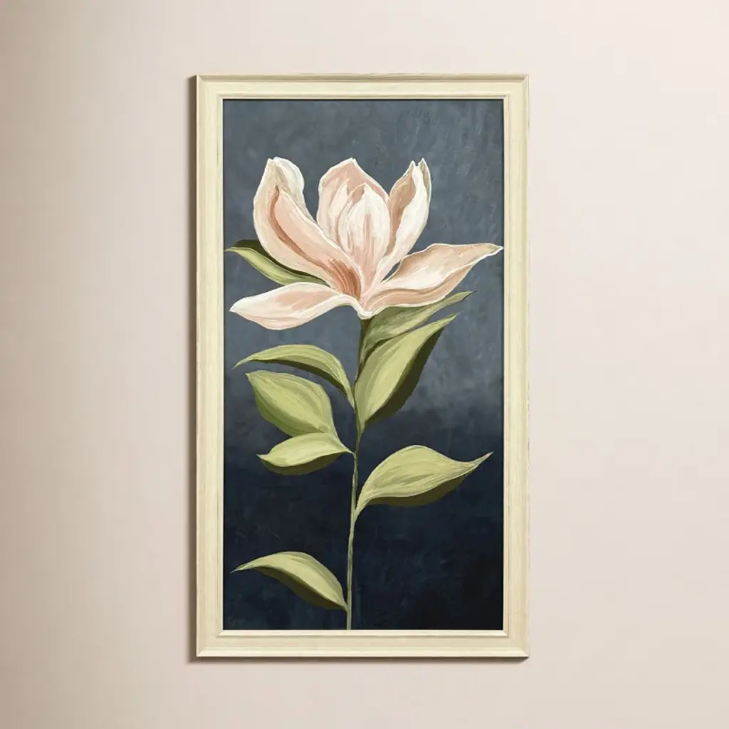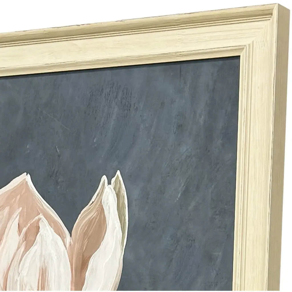A pink magnolia stem is eye-catching with a dark background. Giclee is framed to the image in a traditional scoop and panel distressed ivory wood.