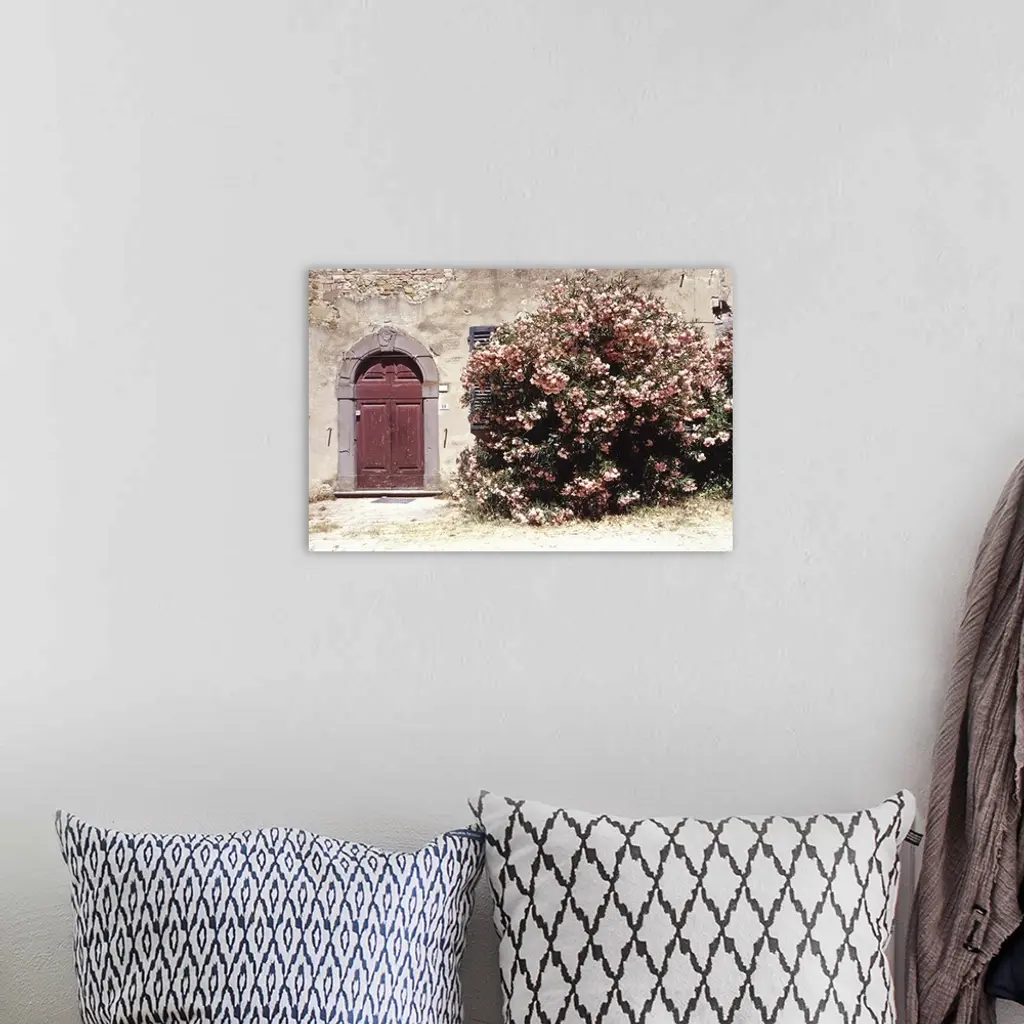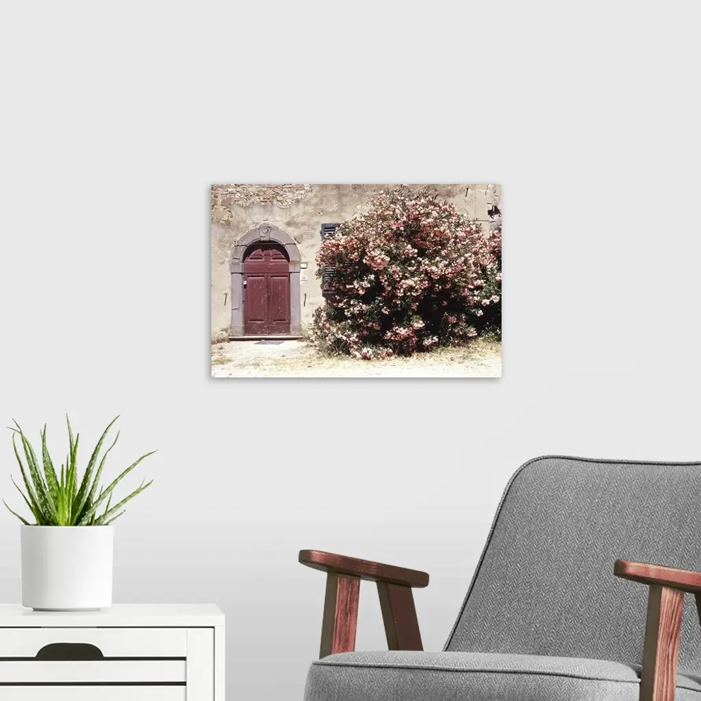Italy, Tuscany, medieval village of Lucardo: pink oleander and door