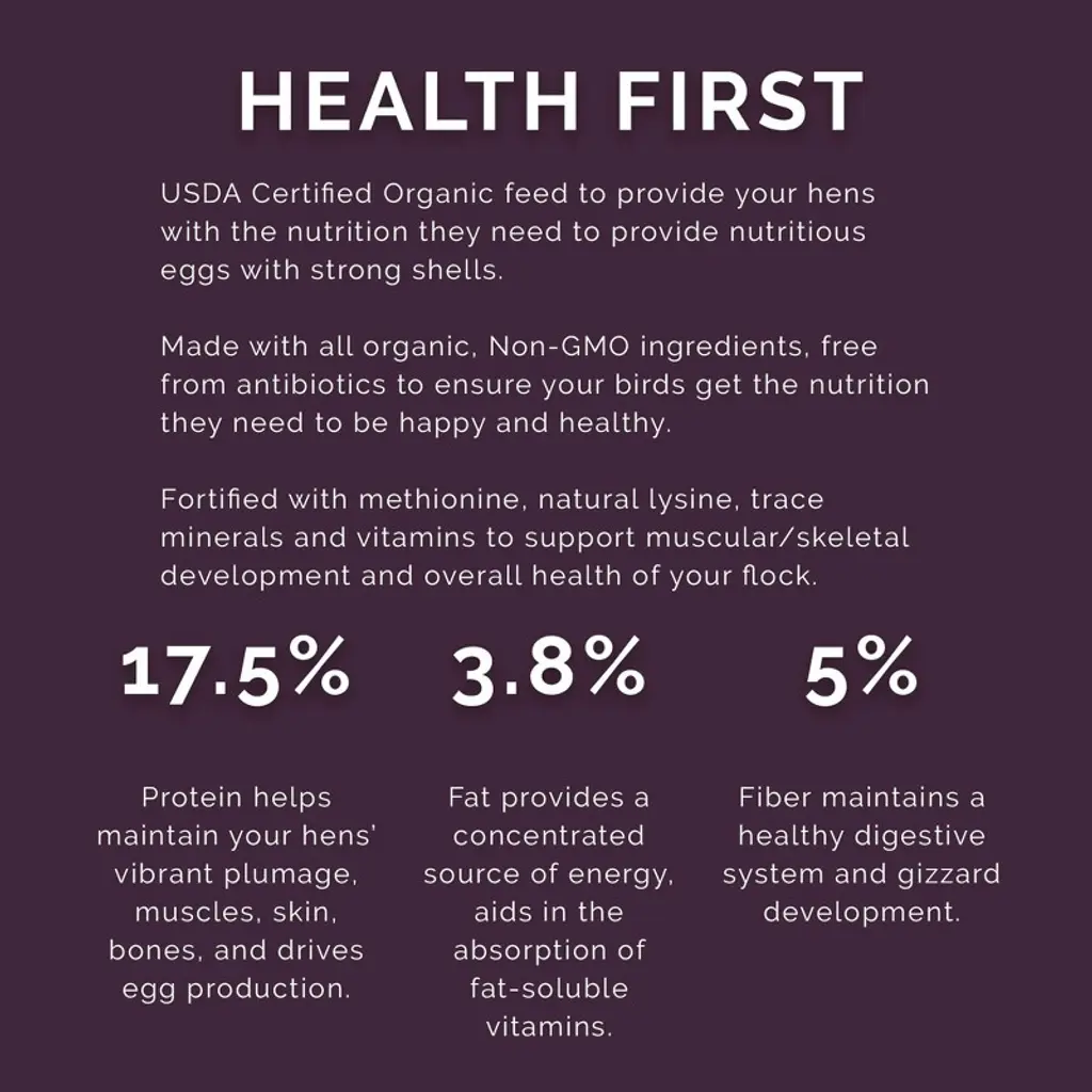 Give your hens the nutrition they deserve with Pink Rose Organix Layer Crumb Feed. Made with all organic, non-GMO ingredients, free from antibiotics to ensure your birds get the nutrition they need to be happy and healthy. Fortified with methionine, natural lysine, trace minerals and vitamins to support muscular/skeletal development and overall health of your flock. With 17.5% protein for strong muscles, 3.8% fat for sustained energy, and 5% fiber for digestive balance, this feed ensures your hens lay nutrient-dense eggs with strong shells. Crafted with 100% organic ingredients, free from soy, corn, antibiotics, and artificial additives, provide your hens with the nutrition they need to provide nutritious eggs with strong shells.