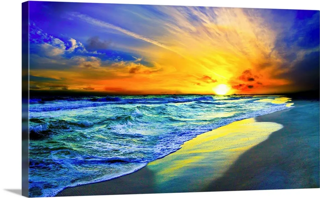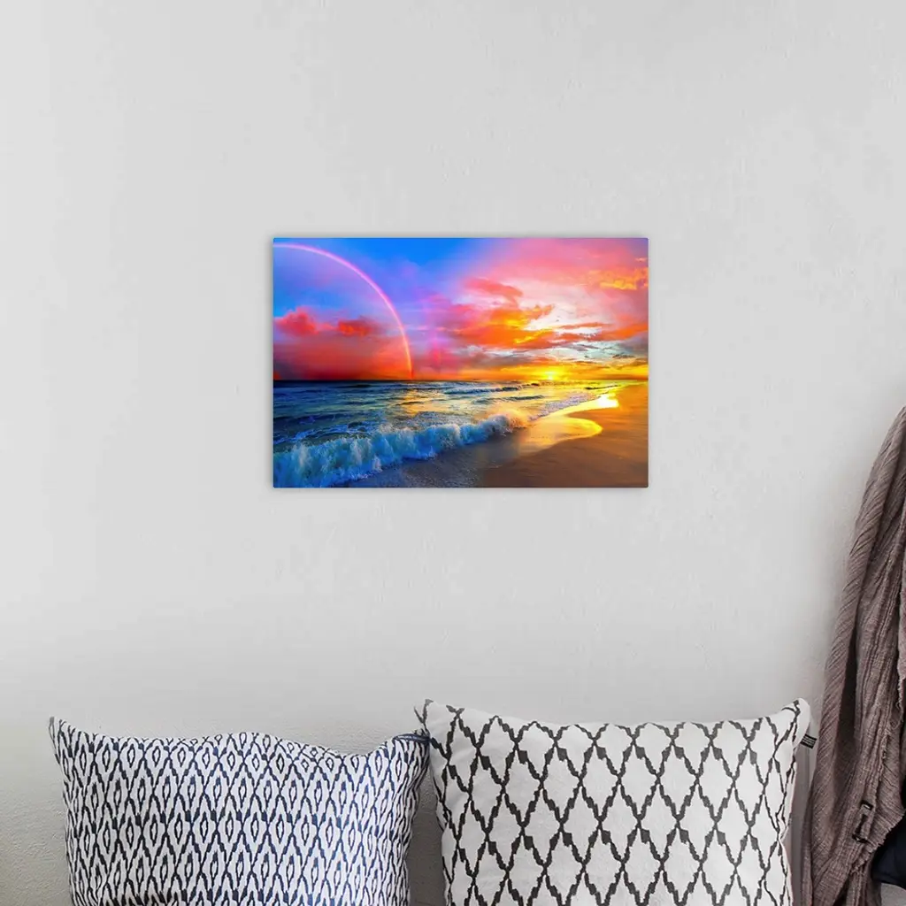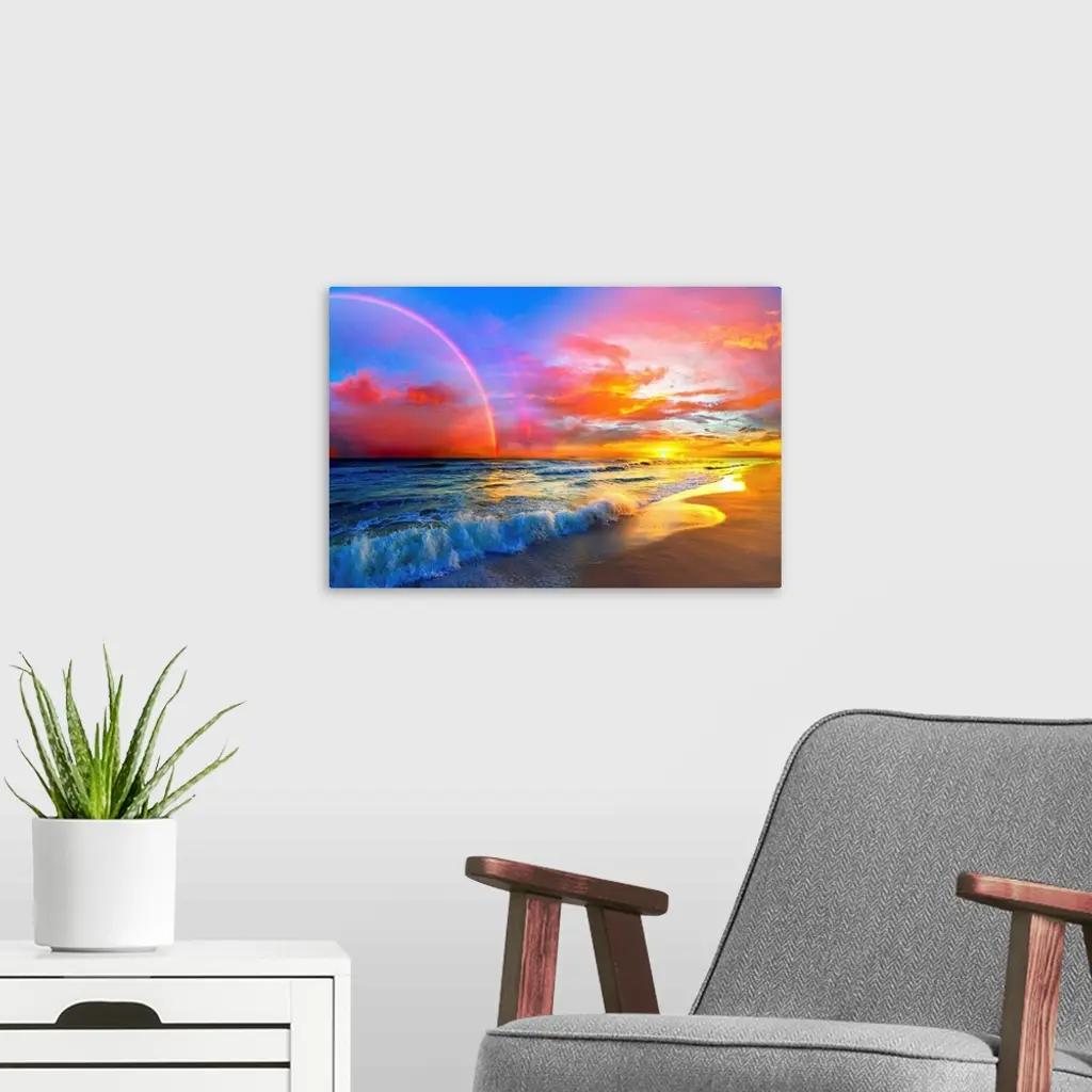 Pink Sunset Beach With Rainbow And Ocean Waves