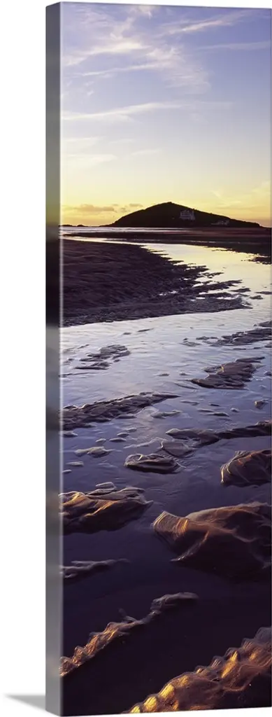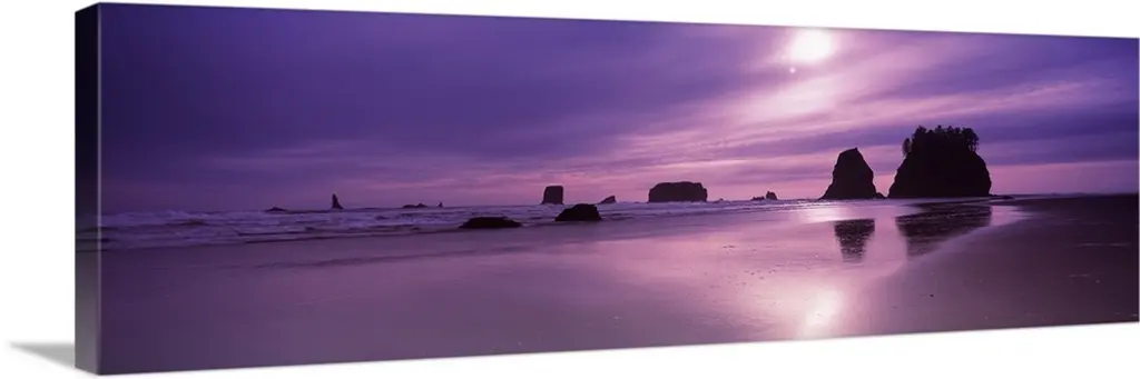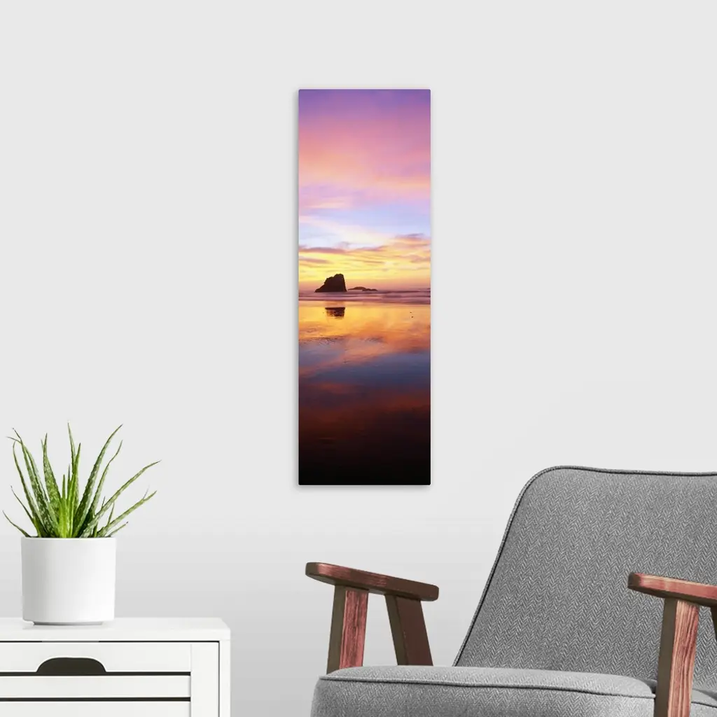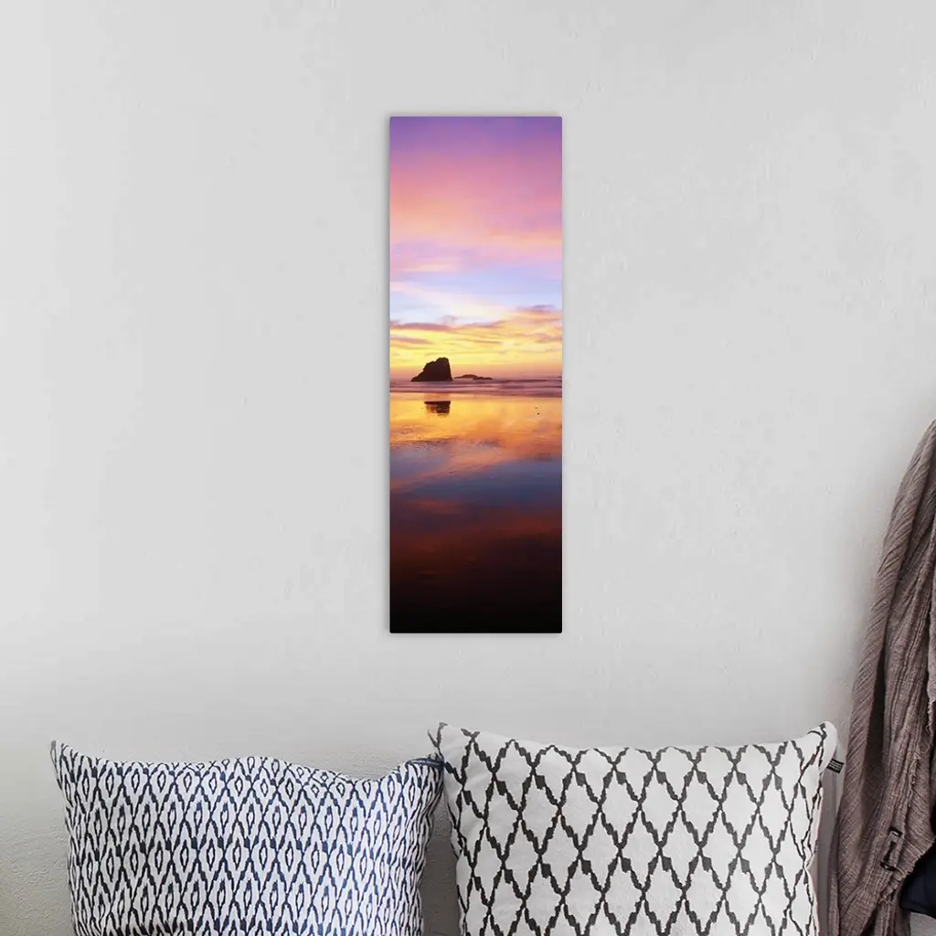A tall panoramic photograph is taken of a large rock formation in the ocean that is silhouetted in the distance under a sunset lit sky.