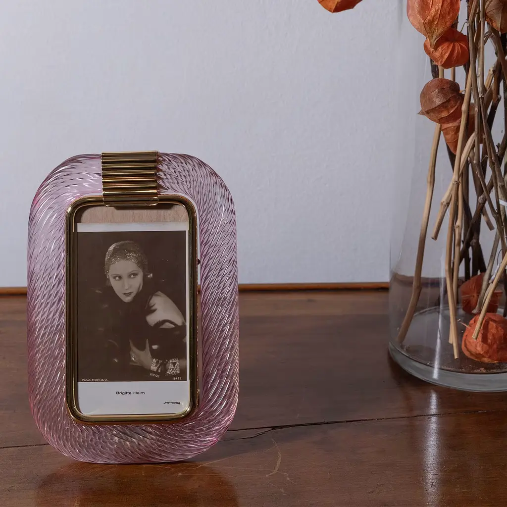 This frame is handcrafted in a historic Venetian glassworks using the traditional blown-glass twisting technique, resulting in a fluid, three-dimensional texture. A delicate pink hue captures and reflects light, underscoring the artisanal skill. The hand-shaped brass structure is offered in a glossy finish and available on request in matte. Additional color variations are offered in the Artemest catalog. A larger size is available upon request; please contact the Concierge for more information.