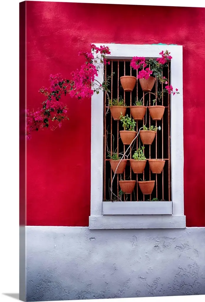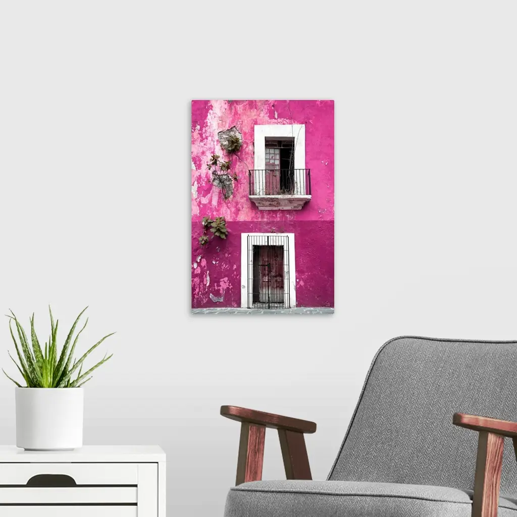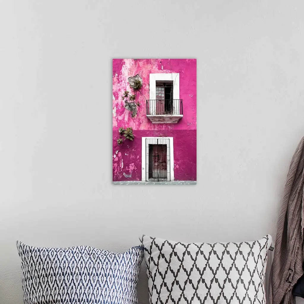Photograph of a rustic pink wall in Mexico with peeling paint, a balcony, door, and plants growing out of the wall. From the Viva Mexico Collection.