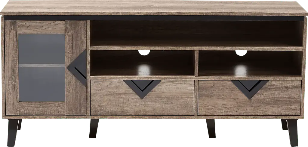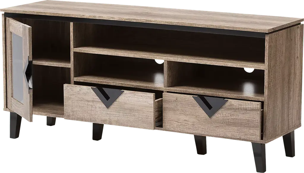 The Pinkshade light brown console combines function and modern style. On a geometric silhouette, this oak veneered console features two drawers and a cabinet door with black triangle vinyl handles. The angled legs in black, supporting the media cabinet while contrasting with the oak veneered finishing showcase the modern look. Constructed of engineered wood, the console is built to last. The console comes with three open shelves with wire management cut-out on the back of the cabinet, enabling the storage of media players, game consoles and DVD's while the drawers can be used as additional storage for controllers, manuals and anything that you would like to store away. Two additional shelves are available behind the glass door for additional storage space. Customer assembly is required.