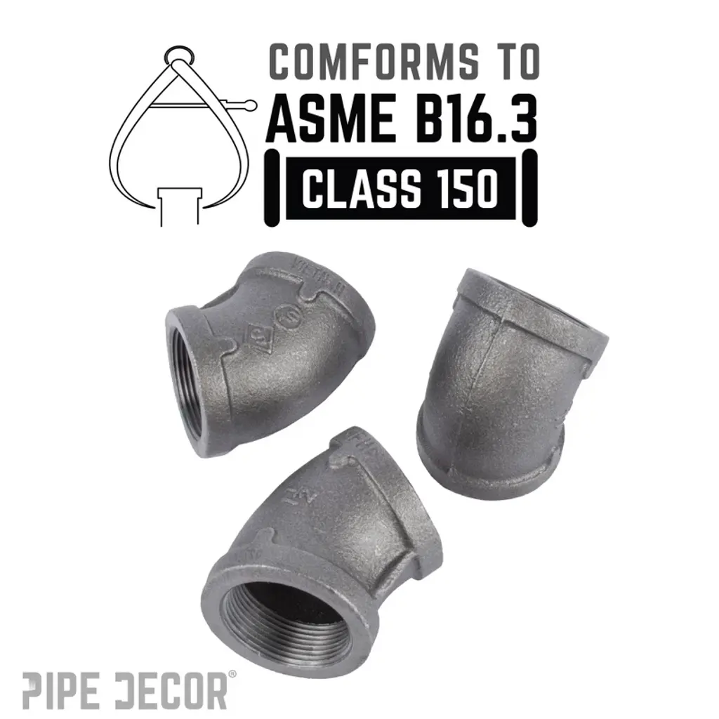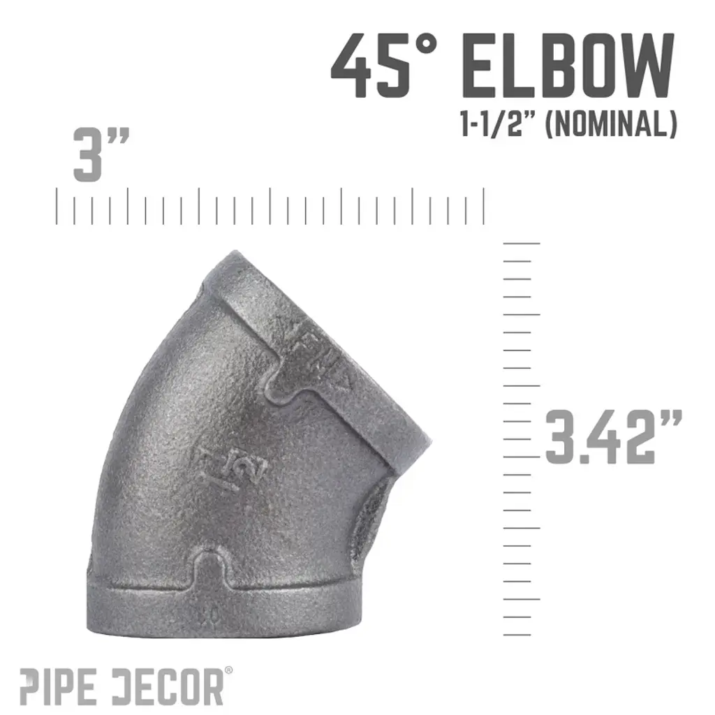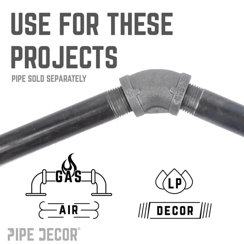 Go in a different direction with 45-degree elbows, perfect for building pipe furniture with unique shapes. Create a one-of-a-kind shelf, lamp, or piece of art that fits your space perfectly. Our fittings are made from durable, industrial-grade malleable iron, 100% authentic and designed to stand the test of time. You’ll recognize PIPE DECOR parts and accessories by their combination of beauty and strength, offering both style and industrial durability. Accept no substitutes—extra pieces and accessories are available for your custom projects and expansions, allowing plug-and-play versatility. These iron fittings complement a wide variety of aesthetics, including steampunk lighting, industrial, factory, French country farmhouse, vintage, retro, reclamation, DIY customized, modern, and more. We recommend cleaning and sealing each fitting before use. IPS threads ensure compatibility with other project materials such as lamp parts, valves, and more, and they work seamlessly with any pipes, fittings, and PIPE DECOR furniture kits of the same diameter.