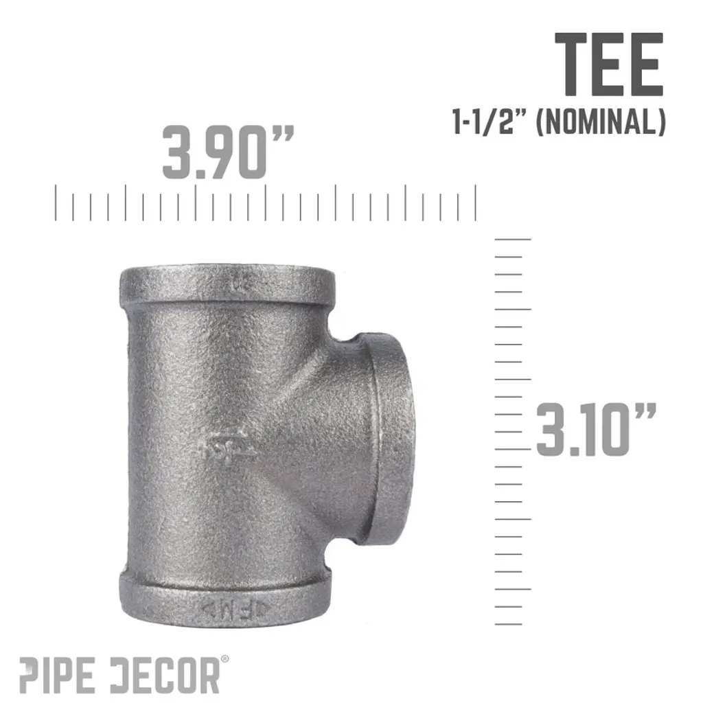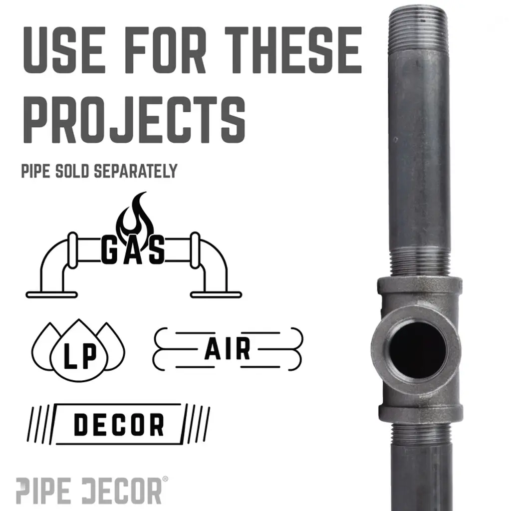 Create a one-of-a-kind shelf, table, lamp, or piece of art that perfectly fits your space. This T-shaped fitting has three places to connect pipes, providing strength and stability to desks, tables, or any of your DIY creations. Our fittings are made from durable, industrial-grade malleable iron. They are 100% authentic and built to stand the test of time. You will know PIPE DECOR parts and accessories when you hold them—beauty and beast, strength and style. These are real industrial fittings for your decorations and designs. Accept no substitutes. Extra pieces and accessories are available for your custom projects and expansions. Plug and play as desired. Perfect for any DIY project, our iron fittings complement a variety of looks and aesthetics, including steampunk lighting, industrial, factory, French country farmhouse, vintage, retro, reclamation, DIY customized, modern, and more. We recommend cleaning and sealing each fitting before use. IPS threads offer compatibility with other project materials such as lamp parts, valves, and more. They are compatible with any pipes, fittings, and PIPE DECOR furniture kits.