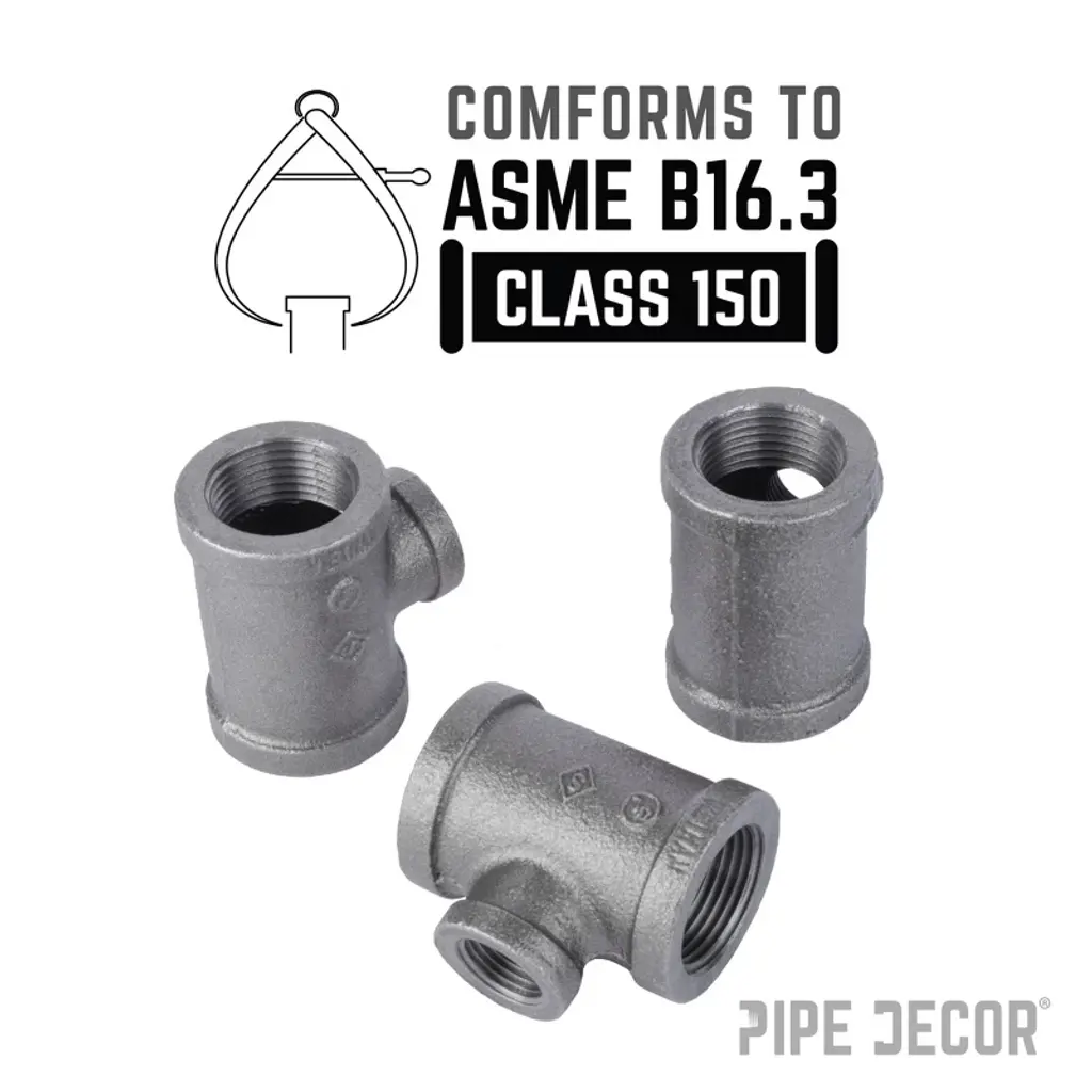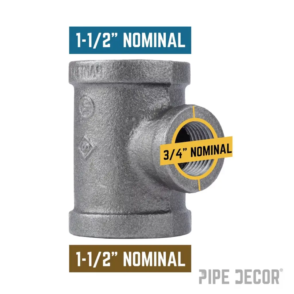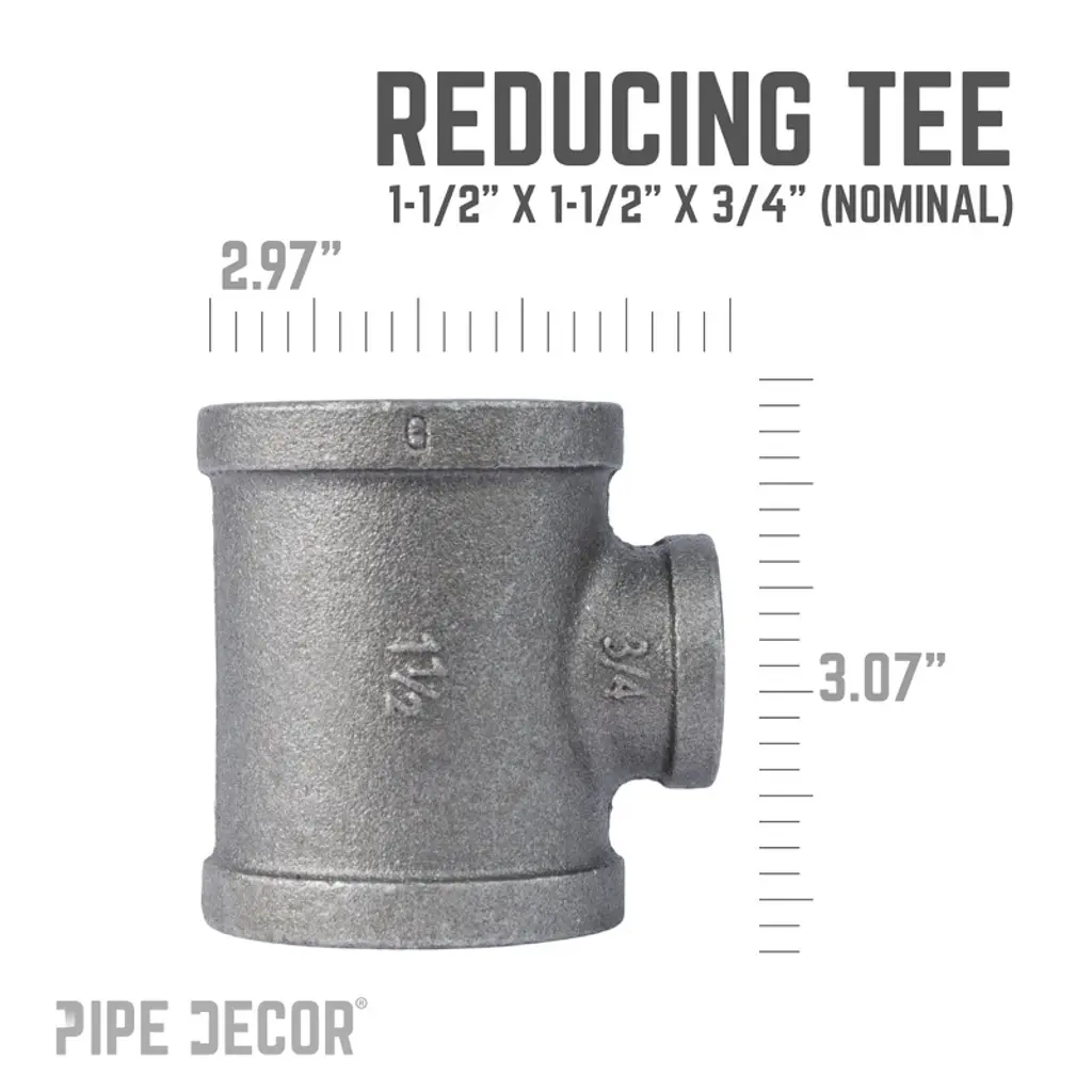 Reducing Tees let you build with complete flexibility—create large pipe legs with smaller crossbars or bigger flange feet with smaller bars. At PIPE DECOR, we use them to add stability and support with smaller crossbars in larger pipe kits. Made from cast iron and machined to spec, these fittings are hydrostatically tested to hold pressure. Black pipe and fittings are suitable for gas, air, liquid petroleum, and home décor projects. Each fitting is coated in light grease to prevent rust, and for décor use, we recommend cleaning and sealing them. Reducing Tees are available in sizes from 2 in. to 1/8 in.