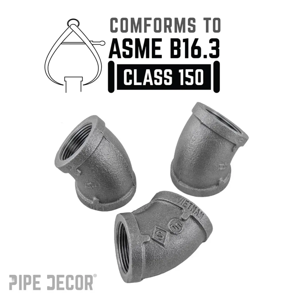 Go in a different direction with 45-degree elbows. They’re perfect for building pipe furniture with unique shapes. Create a one-of-a-kind shelf, lamp, or piece of art that perfectly fits your space. Our fittings are made from durable, industrial-grade malleable iron. They are 100% authentic and built to stand the test of time. You will know PIPE DECOR parts and accessories when you hold them—beauty and beast, strength and style. These are real industrial fittings for your decorations and designs. Accept no substitutes. Extra pieces and accessories are available for your custom projects and expansions. Plug and play as desired. Perfect for any DIY project, our iron fittings complement a variety of looks and aesthetics, including steampunk lighting, industrial, factory, French country farmhouse, vintage, retro, reclamation, DIY customized, modern, and more. We recommend cleaning and sealing each fitting before use. IPS threads offer compatibility with other project materials such as lamp parts, valves, and more. They are compatible with any pipes, fittings, and PIPE DECOR furniture kits of the same diameter.