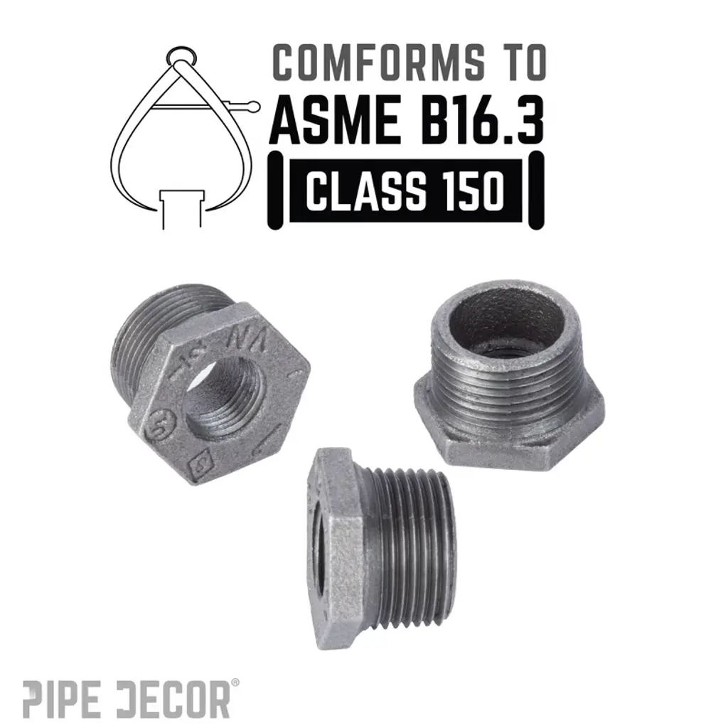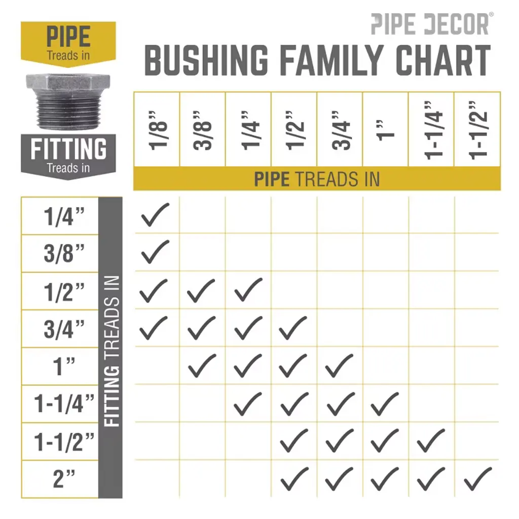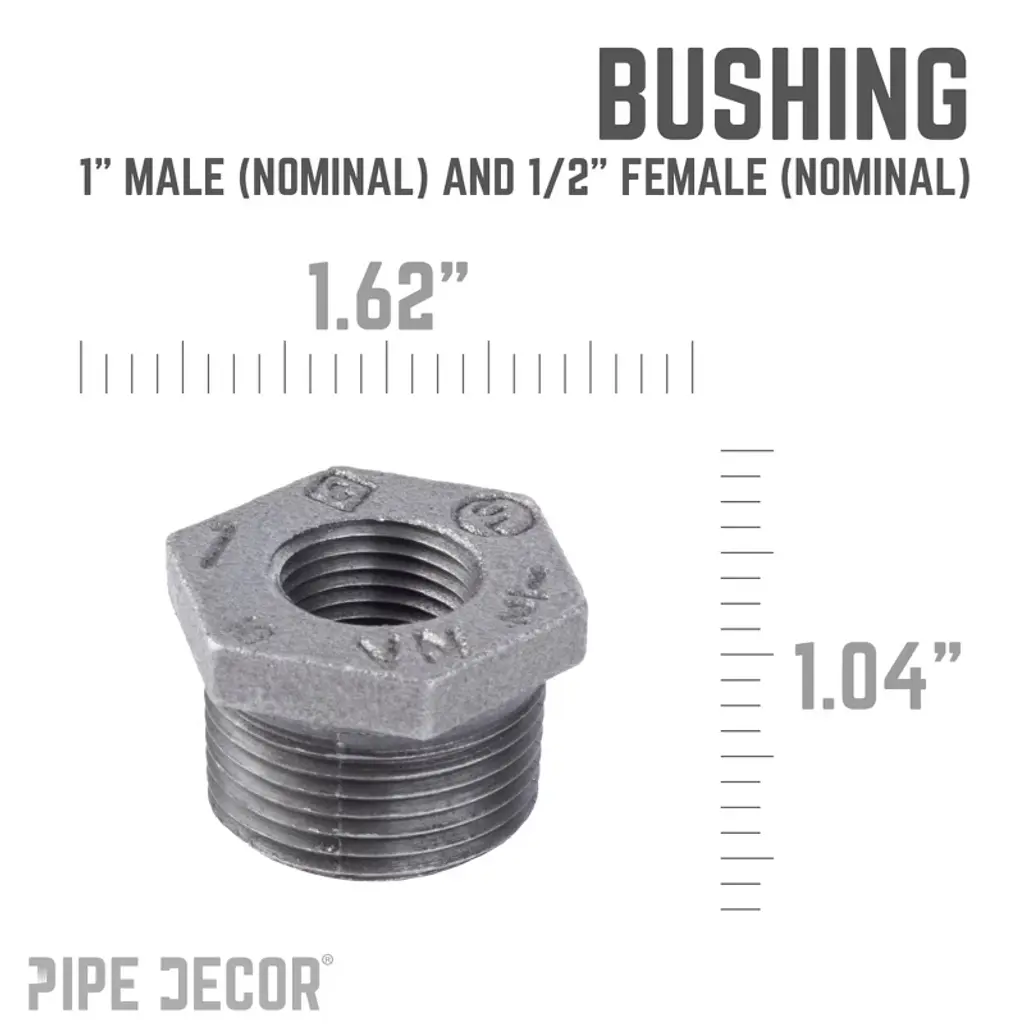 Bushings are incredibly useful, making all standard fittings more versatile by turning basic elbows into reducing elbows and allowing a bigger pipe to fit into your next pipe project. At PIPE DECOR, we use them to add smaller crossbars and provide stability to larger pipe kits. Our fittings are made of cast iron, machined to specification, and hydrostatically tested to hold pressure. Black pipe and fittings can be used for gas, air, liquid petroleum, and home décor applications. They are coated in a light grease to prevent rust, but for home décor projects, cleaning and sealing will be necessary. Bushings are available in sizes ranging from 2 inches down to 1/8 inch.