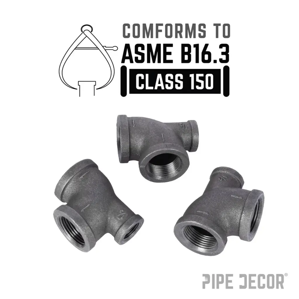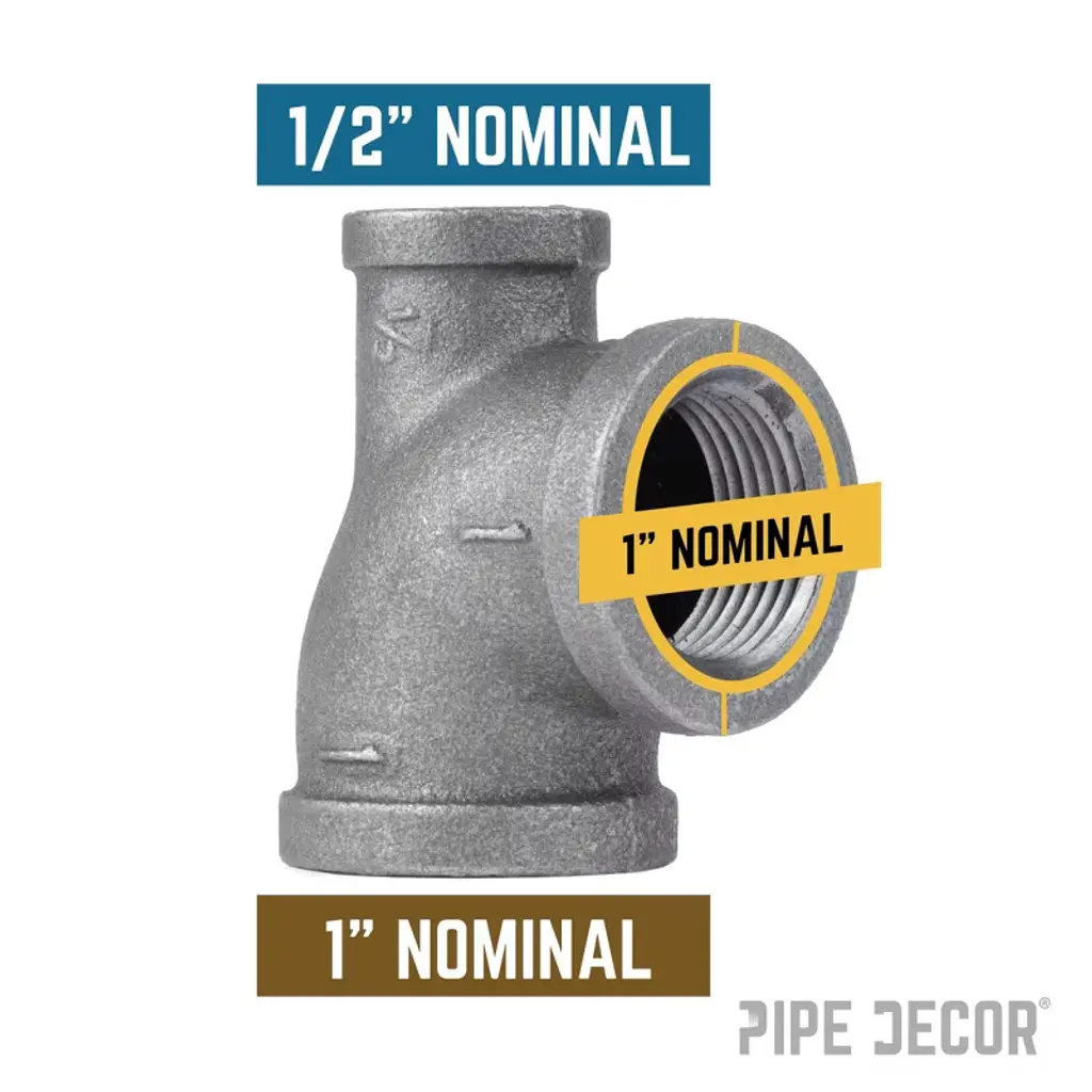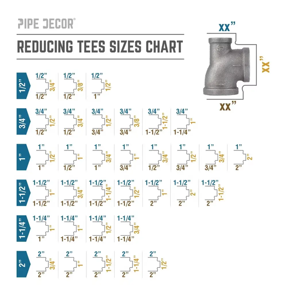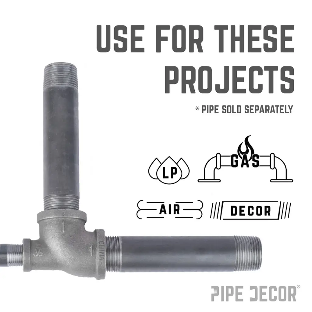 Reducing Tees give you the flexibility to build whatever you dream of. Use them to create large pipe legs with smaller cross bars or to make bigger flange feet with smaller bars. At PIPE DECOR, we use them to add smaller cross bars and stability to larger pipe kits. Our fittings are made from cast iron, machined to specification, and hydrostatically tested to hold pressure. Black pipe and fittings can be used for gas, air, liquid petroleum, and home décor projects. Each fitting is coated in a light grease to prevent rust, and for home décor use, you will need to clean and seal them. Reducing Tees are available in sizes ranging from 2 inches down to 1/8 inch.