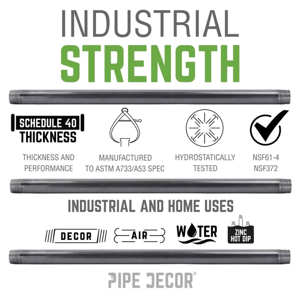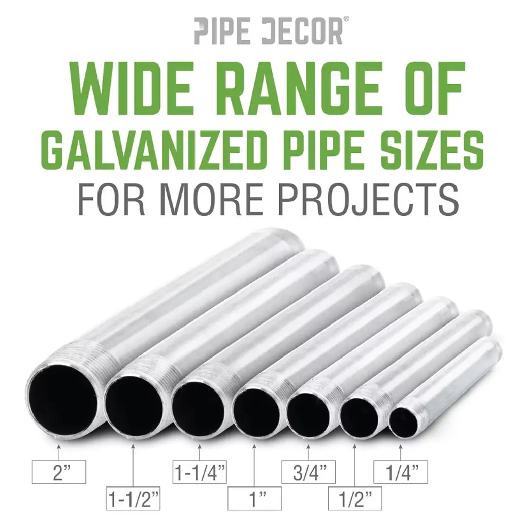 1/2 in., 3/4 in., and 1 in. (internal nominal diameters.) Lengths from Close Nipple, to 72 in. PIPE-DECOR GALVANIZED STEEL PIPE: Our galvanized steel pipe is pre-cut, threaded, genuine schedule 40 steel, and certified NSF 61, and lead-free. Measurements are thread to thread. Each pipe has been hydrostatically tested and is ASTM and ASME compliant and galvanized in a hot zinc bath. Ideal for pipe decor, air, and water, applications that are within code. Quality industrial steel style complements any decor. Standard IPS threads for compatibility with other threaded parts. CREATE CUSTOM PIPE FIXTURES AND FURNISHINGS: Create a one-of-a-kind shelf, table, lamp, or piece of art that fits your space. CLEANING: We recommend wiping each piece with a cloth or paper towel to remove any factory residue. There is no need to seal galvanized pipe and fittings. WE ARE HERE TO HELP: Please reach out to us if you have any questions or issues of any kind. We stand by our products are committed to our customers. We want you to be satisfied with your purchase and hope that you share your unique creations with us and your friends.
