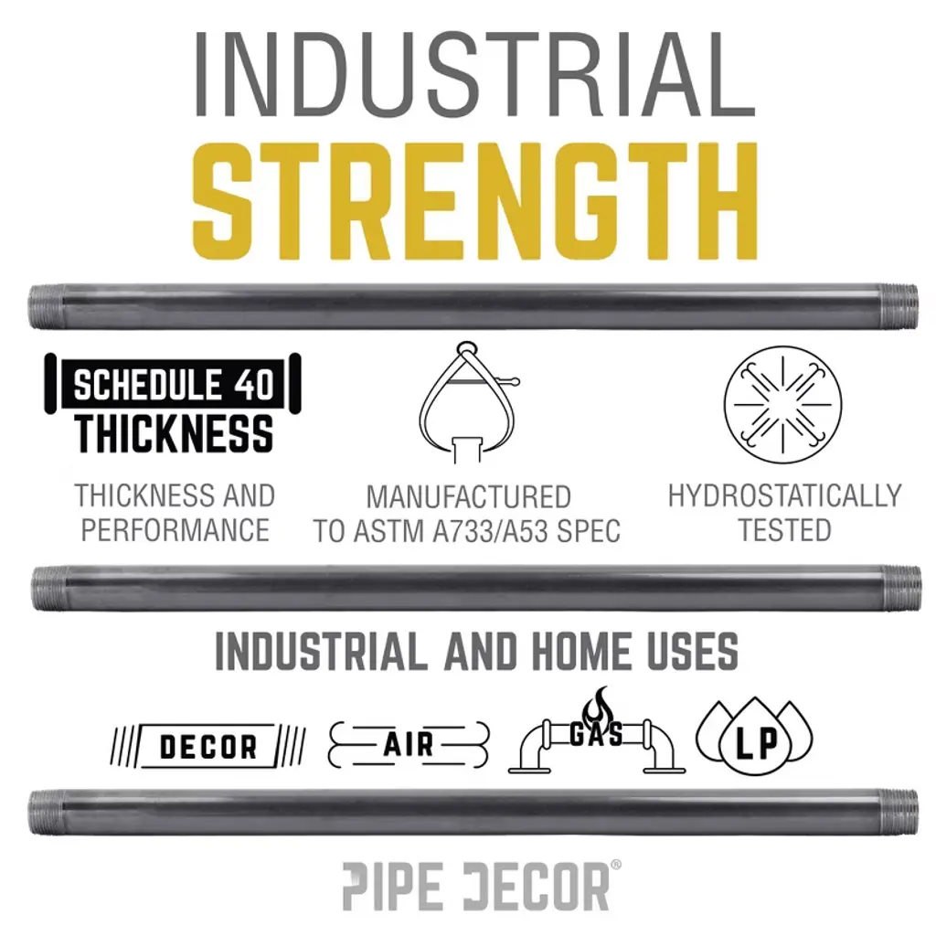 PIPE DECOR pre-cut pipe can be used for both plumbing and decor installations. This genuine schedule 40 black steel pipe has been hydrostatically tested and meets ASTM and ASME standards. Each pipe comes pre-threaded, free of stickers, and coated in a light industrial oil to prevent rusting, making it ideal for pipe decor or standard gas, air, and liquid propane applications. Quality industrial black steel complements any aesthetic, and IPS threads provide compatibility with other project materials such as lamp parts, valves, and more. Our PIPE DECOR line also includes a wide variety of fittings and connectors, allowing you to build custom projects or use our pipe kits to achieve a personalized look. Pipe will require cleaning and sealing prior to use. Authentic black steel gives your furniture a modern, industrial appearance. Pipes are 100% schedule 40 black steel and suitable for plumbing applications in air, natural gas, and liquid propane, as well as for home decor. Clean and seal instructions are included. Every pipe is hydrostatically tested, UL- and FM-listed, and fully compliant with ASTM and ASME standards. They are compatible with any pipes, fittings, and PIPE DECOR furniture kits of the same diameter. We are happy to assist with any questions or concerns, so please do not hesitate to reach out.