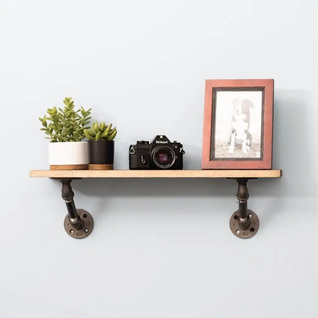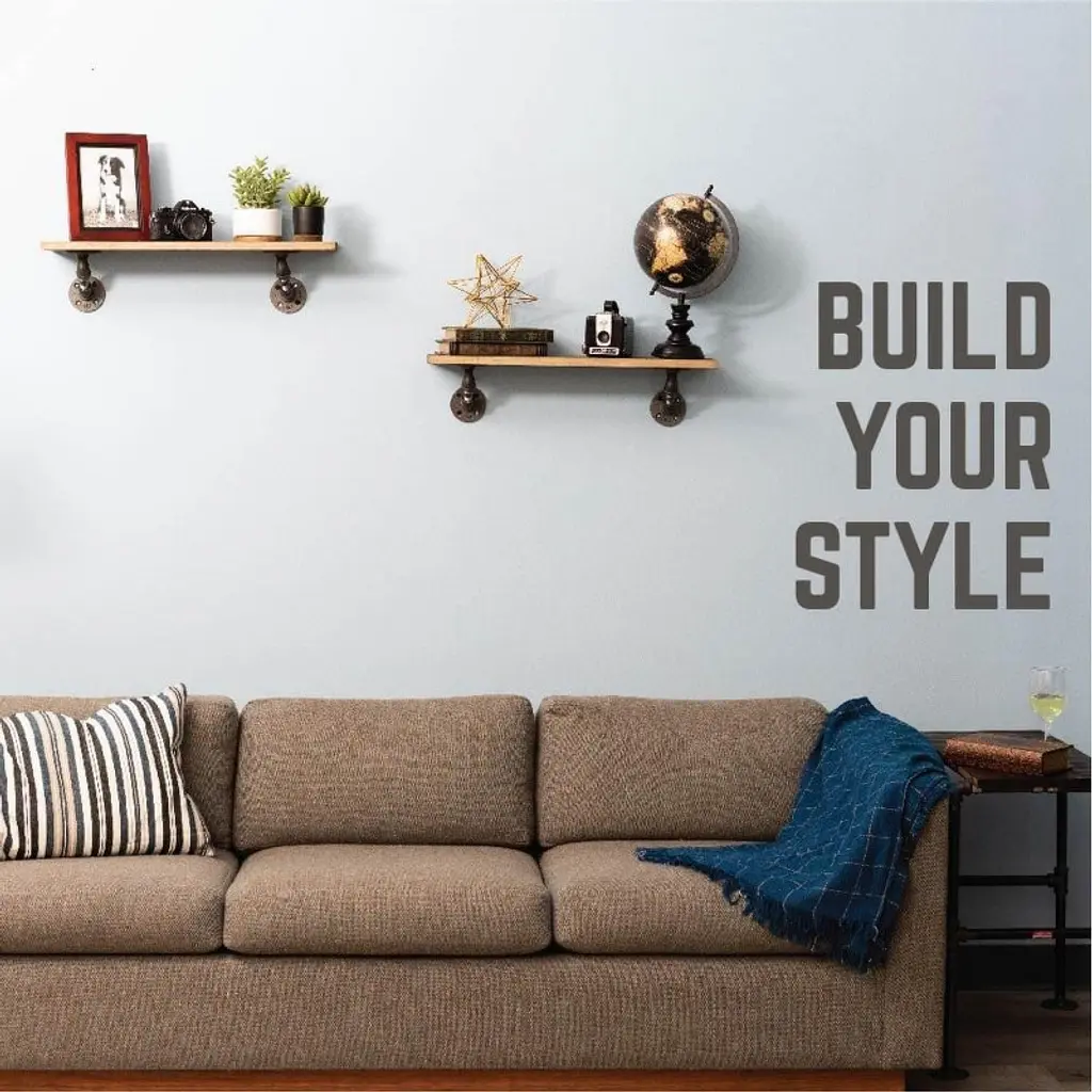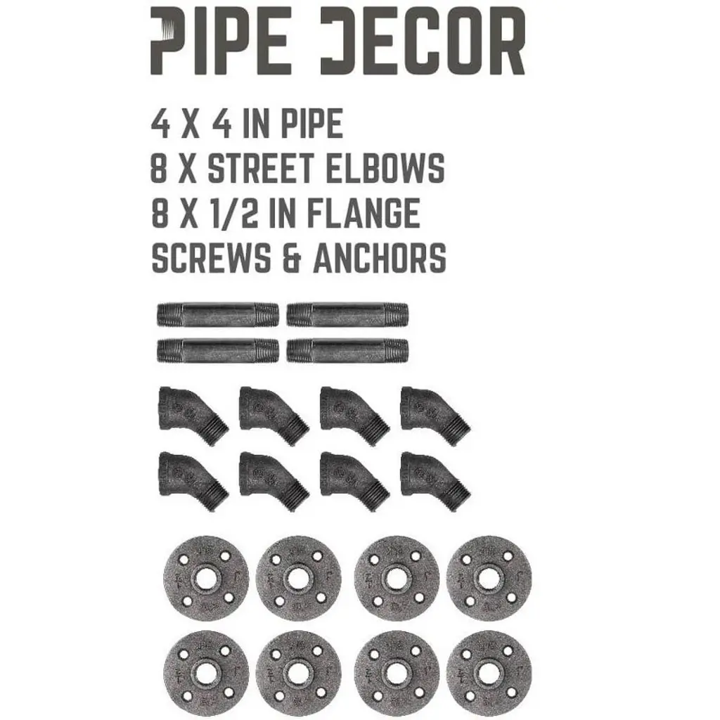 Add eye-catching style to your new set of shelves with these heavy-duty pipe shelving brackets. Crafted with cast iron fittings and black steel pipe, they pair beautifully with woods of various colors and sizes. These brackets showcase your sense of style and attention to detail while fitting a wide range of aesthetics, including steampunk lighting, industrial, factory, French country farmhouse, vintage, retro reclamation, and DIY. You will know Pipe Decor parts and accessories when you hold them. Beauty and beast. Strength and style. This is real industrial pipe for your creative design needs—accept no substitutes. All Pipe Decor pipe and fittings come coated in a light industrial grease to prevent rusting. Clean and seal each piece before assembly to keep them rust-free, then apply polyurethane spray to protect the surface from rust and scratches. The kit includes all materials necessary to make four brackets. Each assembled angled bracket will hold a shelf 6 inches deep or more and is weight-tested to support up to 50 lbs. with anchors and screws in drywall. For maximum stability, we recommend securing the flanges into at least one wood stud. The pipe is made from welded schedule 40 steel, and the final color varies from dark grey to black.
