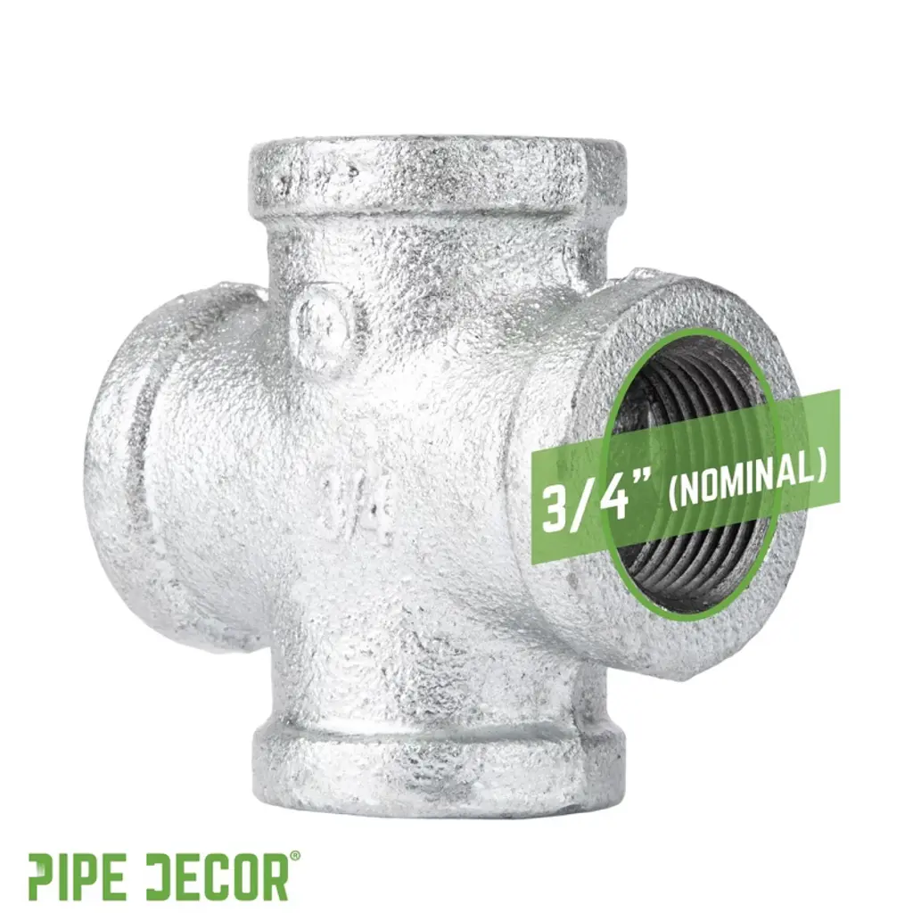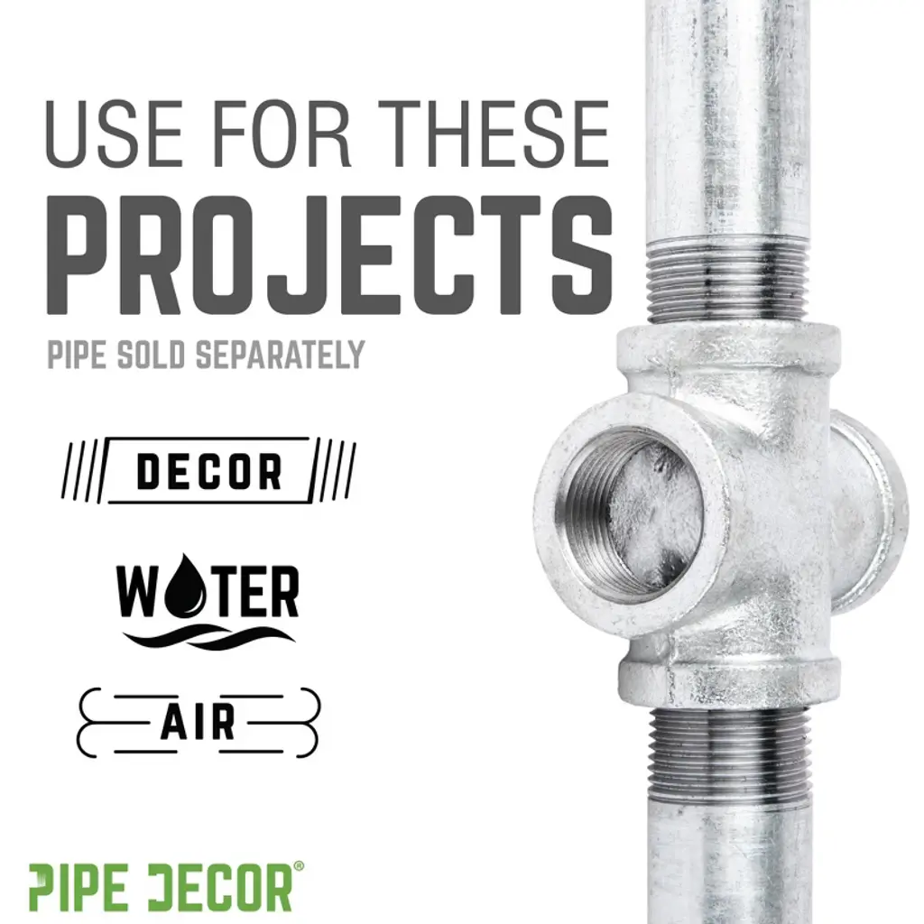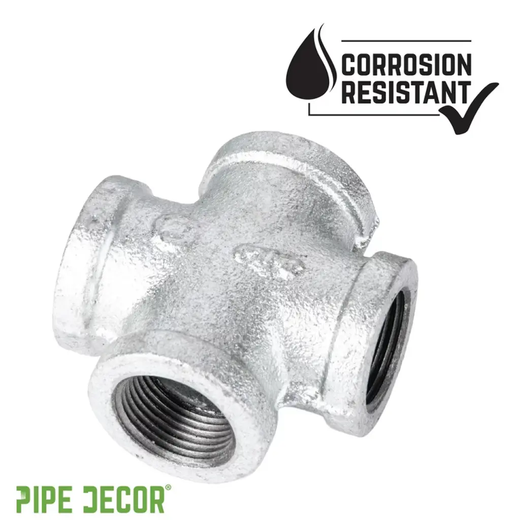 Let your DIY dreams run wild with galvanized cross fittings, the perfect addition to any table, desk, or fixture. This four-way fitting allows you to connect four pipes, each at a 90-degree angle from the next, giving you endless possibilities for custom creations. Galvanized fittings feature a silver color with a shiny finish that brings a clean, polished look to your pipe furniture. Made from durable, industrial-grade malleable iron, these fittings are 100% authentic and built to stand the test of time. You will recognize PIPE DECOR parts and accessories by their unmistakable combination of beauty and strength—real industrial fittings for your designs. Accept no substitutes. Extra pieces and accessories are available for custom projects and expansions, allowing you to plug and play as desired. These galvanized pipe fittings are corrosion-resistant and ideal for creating DIY furniture without worrying about rust. They are project-ready and require no cleaning or sealing before use. Iron fittings complement a wide variety of styles and aesthetics, including steampunk lighting, industrial, factory, French country farmhouse, vintage, retro, reclaimed, DIY customized, modern, and more. IPS threads provide compatibility with other project materials such as lamp parts, valves, and additional PIPE DECOR furniture kits of the same diameter.