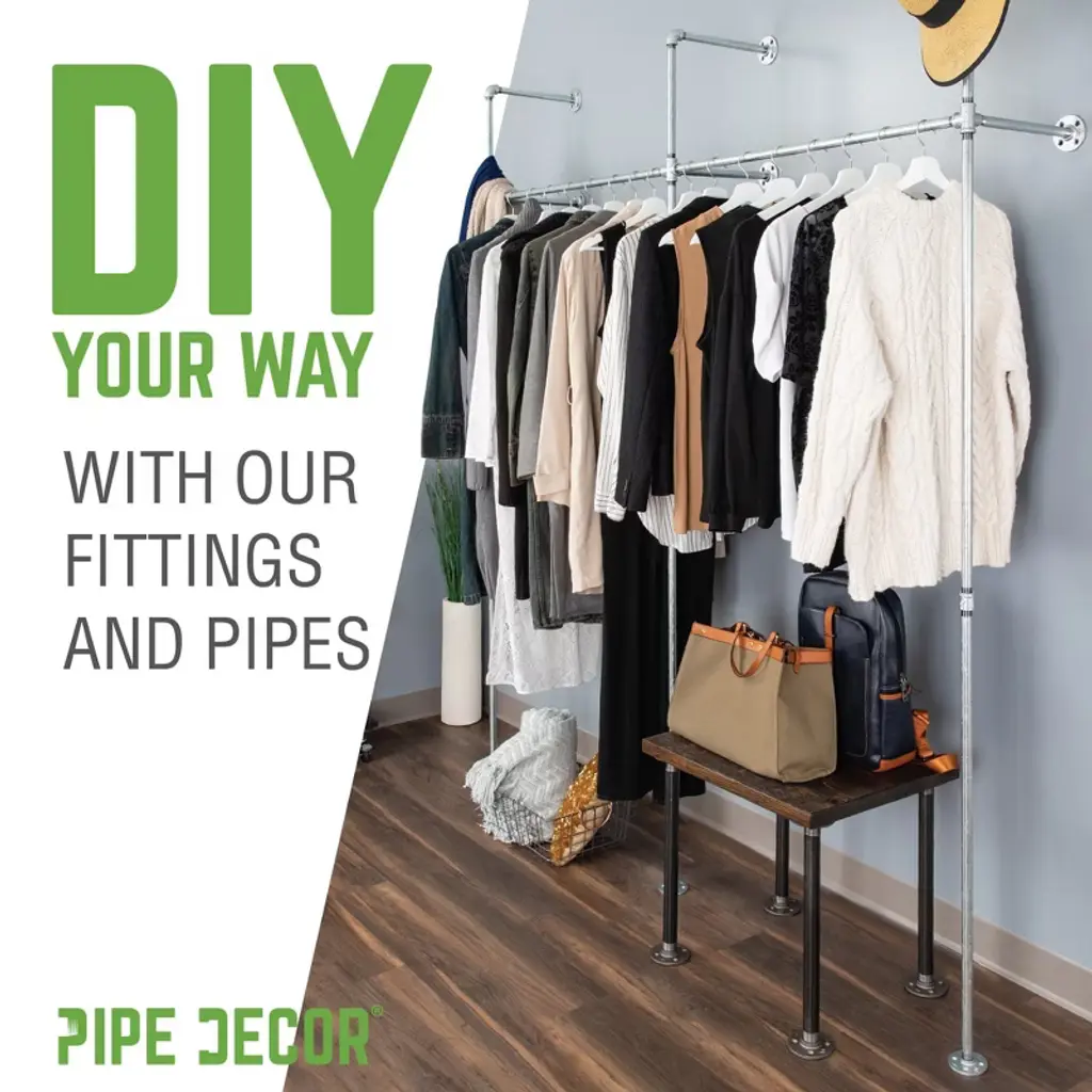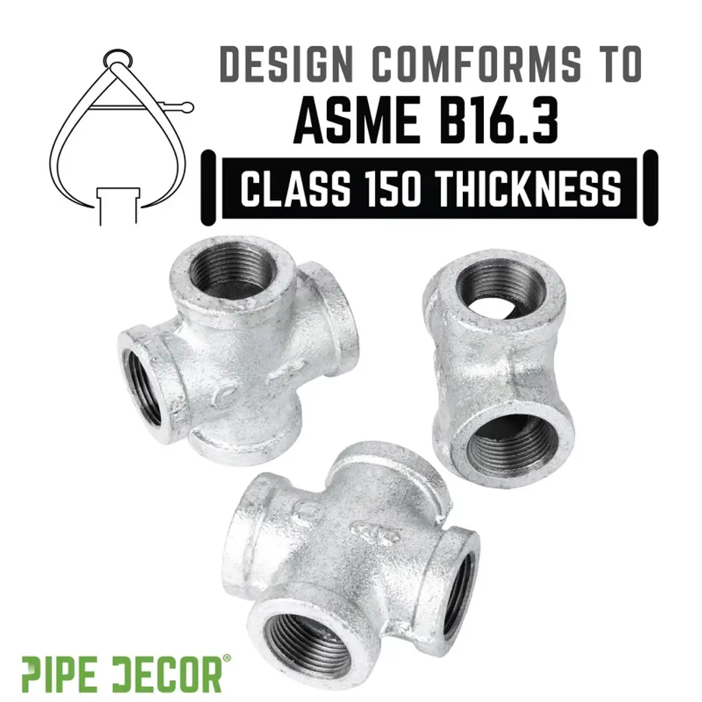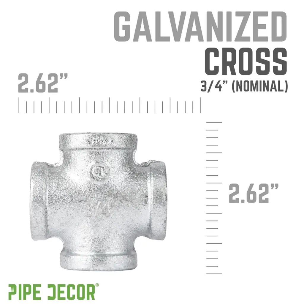 Let your DIY dreams run wild with galvanized cross fittings, the perfect addition to any table, desk, or fixture. This four-way fitting allows you to connect four pipes, each at a 90-degree angle from the next, giving you endless possibilities for custom creations. Galvanized fittings feature a silver color with a shiny finish that brings a clean, polished look to your pipe furniture. Made from durable, industrial-grade malleable iron, these fittings are 100% authentic and built to stand the test of time. You will recognize PIPE DECOR parts and accessories by their unmistakable combination of beauty and strength—real industrial fittings for your designs. Accept no substitutes. Extra pieces and accessories are available for custom projects and expansions, allowing you to plug and play as desired. These galvanized pipe fittings are corrosion-resistant and ideal for creating DIY furniture without worrying about rust. They are project-ready and require no cleaning or sealing before use. Iron fittings complement a wide variety of styles and aesthetics, including steampunk lighting, industrial, factory, French country farmhouse, vintage, retro, reclaimed, DIY customized, modern, and more. IPS threads provide compatibility with other project materials such as lamp parts, valves, and additional PIPE DECOR furniture kits of the same diameter.