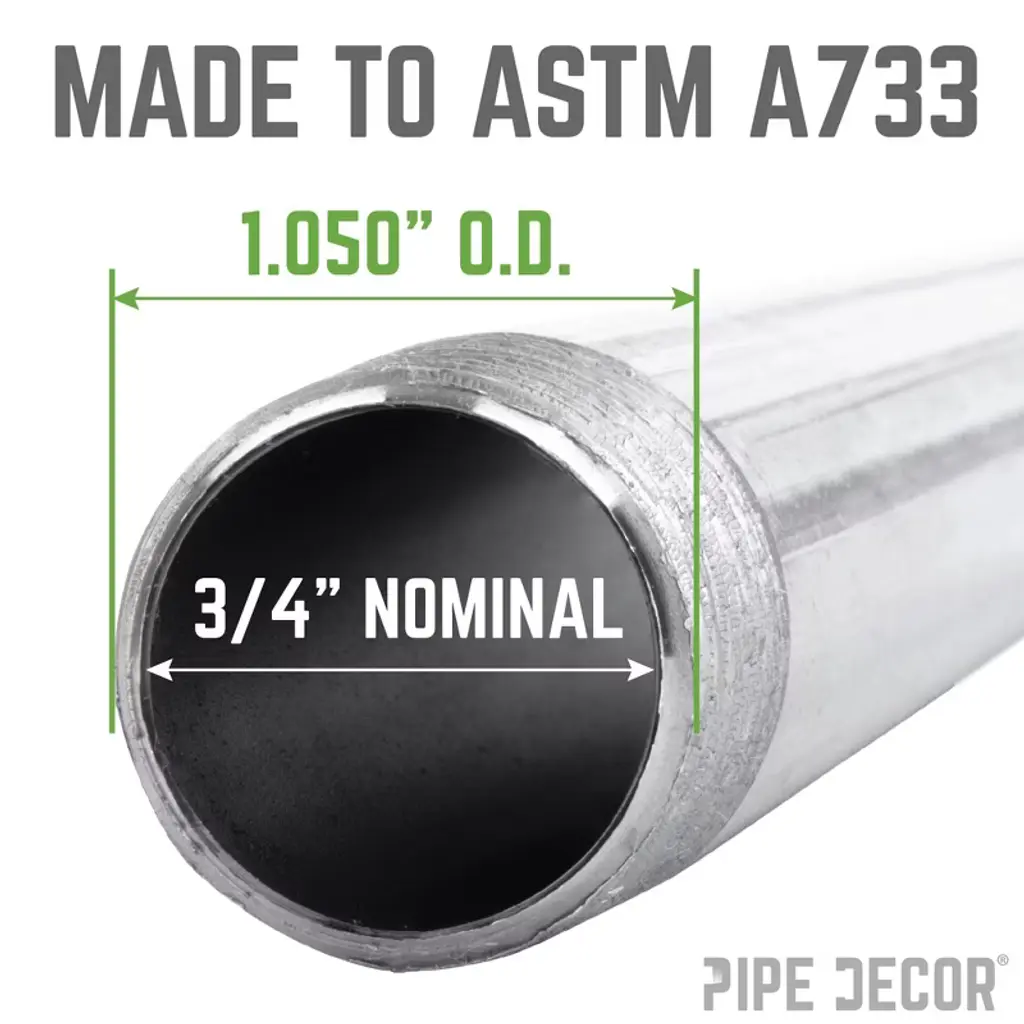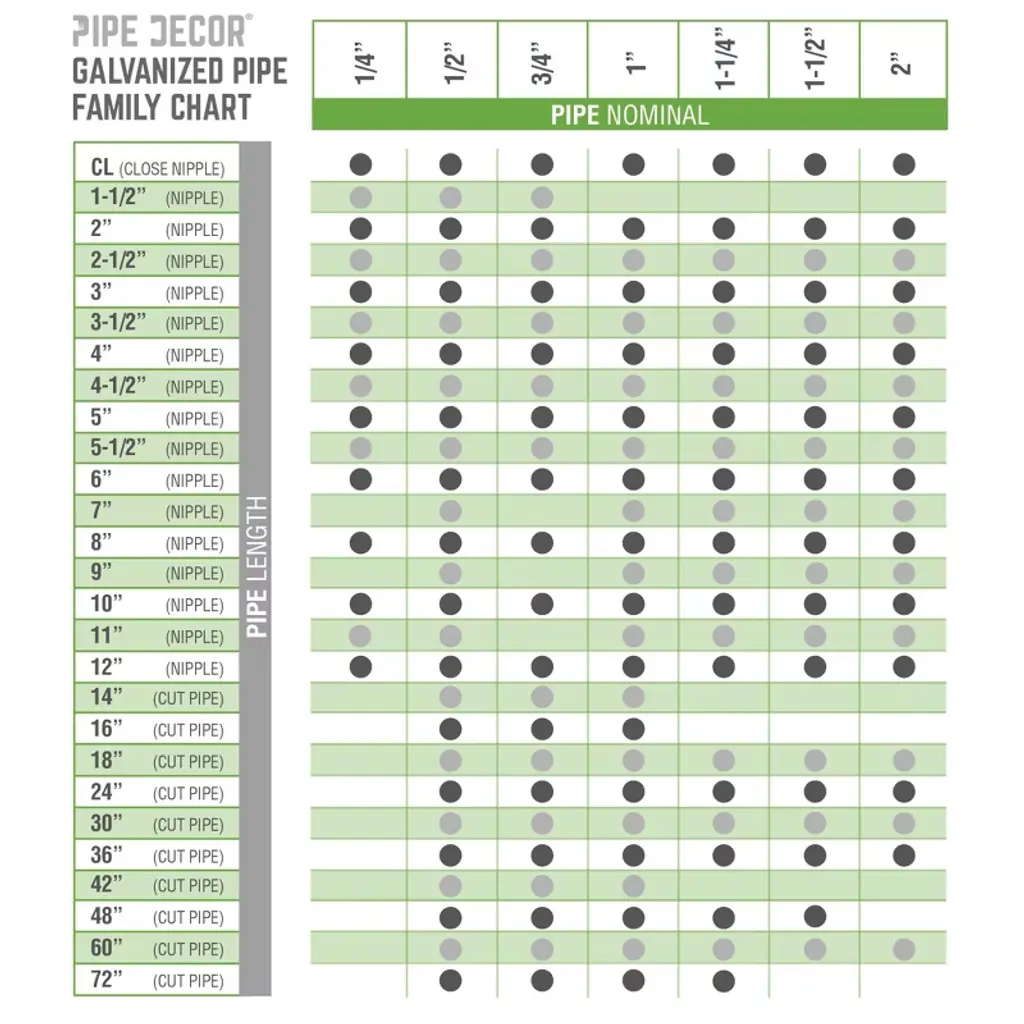 1/2 in., 3/4 in., and 1 in. (internal nominal diameters.) Lengths from Close Nipple, to 72 in. PIPE-DECOR GALVANIZED STEEL PIPE: Our galvanized steel pipe is pre-cut, threaded, genuine schedule 40 steel, and certified NSF 61, and lead-free. Measurements are thread to thread. Each pipe has been hydrostatically tested and is ASTM and ASME compliant and galvanized in a hot zinc bath. Ideal for pipe decor, air, and water, applications that are within code. Quality industrial steel style complements any decor. Standard IPS threads for compatibility with other threaded parts. CREATE CUSTOM PIPE FIXTURES AND FURNISHINGS: Create a one-of-a-kind shelf, table, lamp, or piece of art that fits your space. CLEANING: We recommend wiping each piece with a cloth or paper towel to remove any factory residue. There is no need to seal galvanized pipe and fittings. WE ARE HERE TO HELP: Please reach out to us if you have any questions or issues of any kind. We stand by our products are committed to our customers. We want you to be satisfied with your purchase and hope that you share your unique creations with us and your friends.