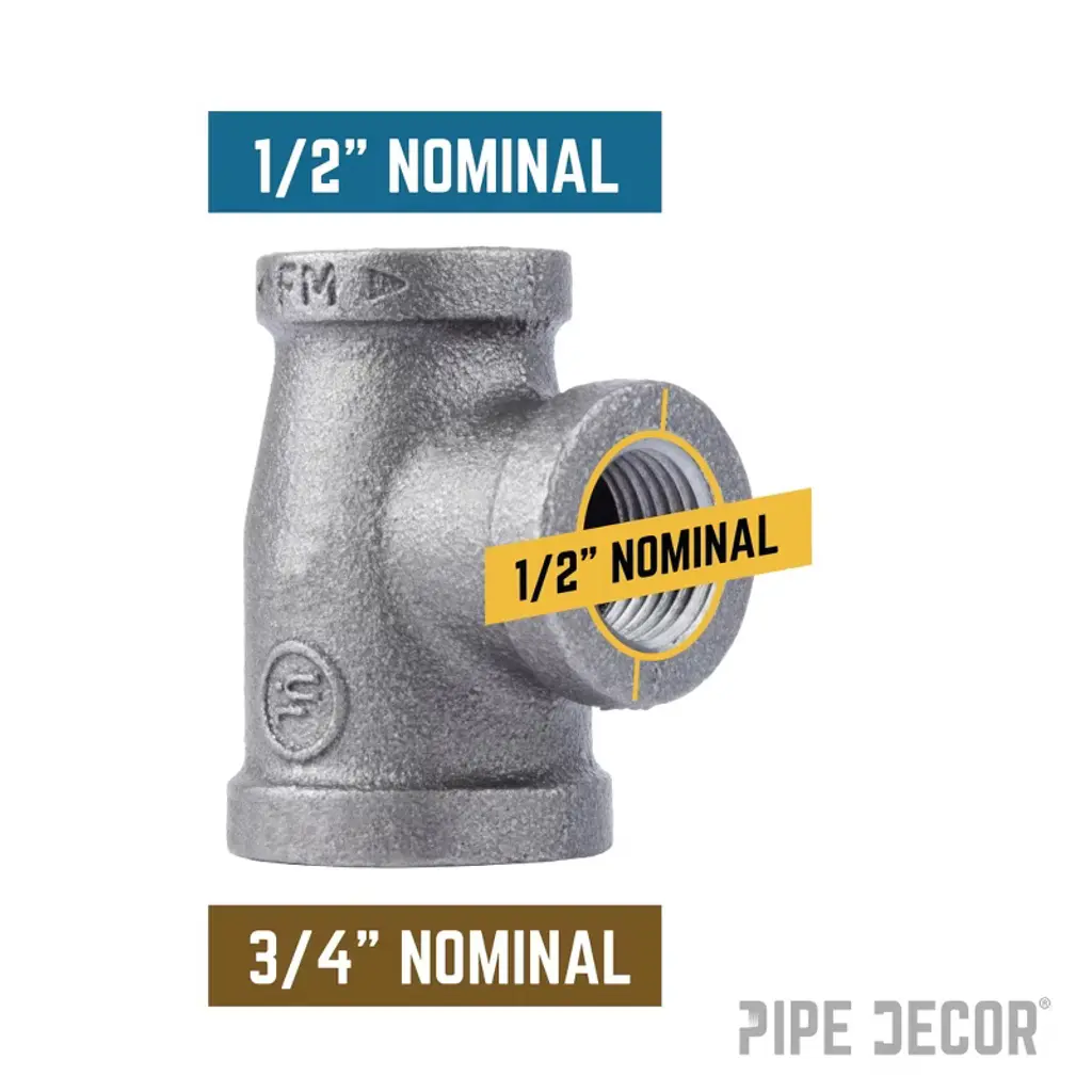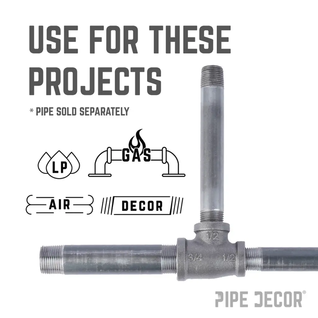 Reducing Tees give you the flexibility to build whatever you dream of. Use them to create large pipe legs with smaller cross bars or to make bigger flange feet with smaller bars. At PIPE DECOR, we use them to add smaller cross bars and stability to larger pipe kits. Our fittings are made from cast iron, machined to specification, and hydrostatically tested to hold pressure. Black pipe and fittings can be used for gas, air, liquid petroleum, and home décor projects. Each fitting is coated in a light grease to prevent rust, and for home décor use, you will need to clean and seal them. Reducing Tees are available in sizes ranging from 2 inches down to 1/8 inch.