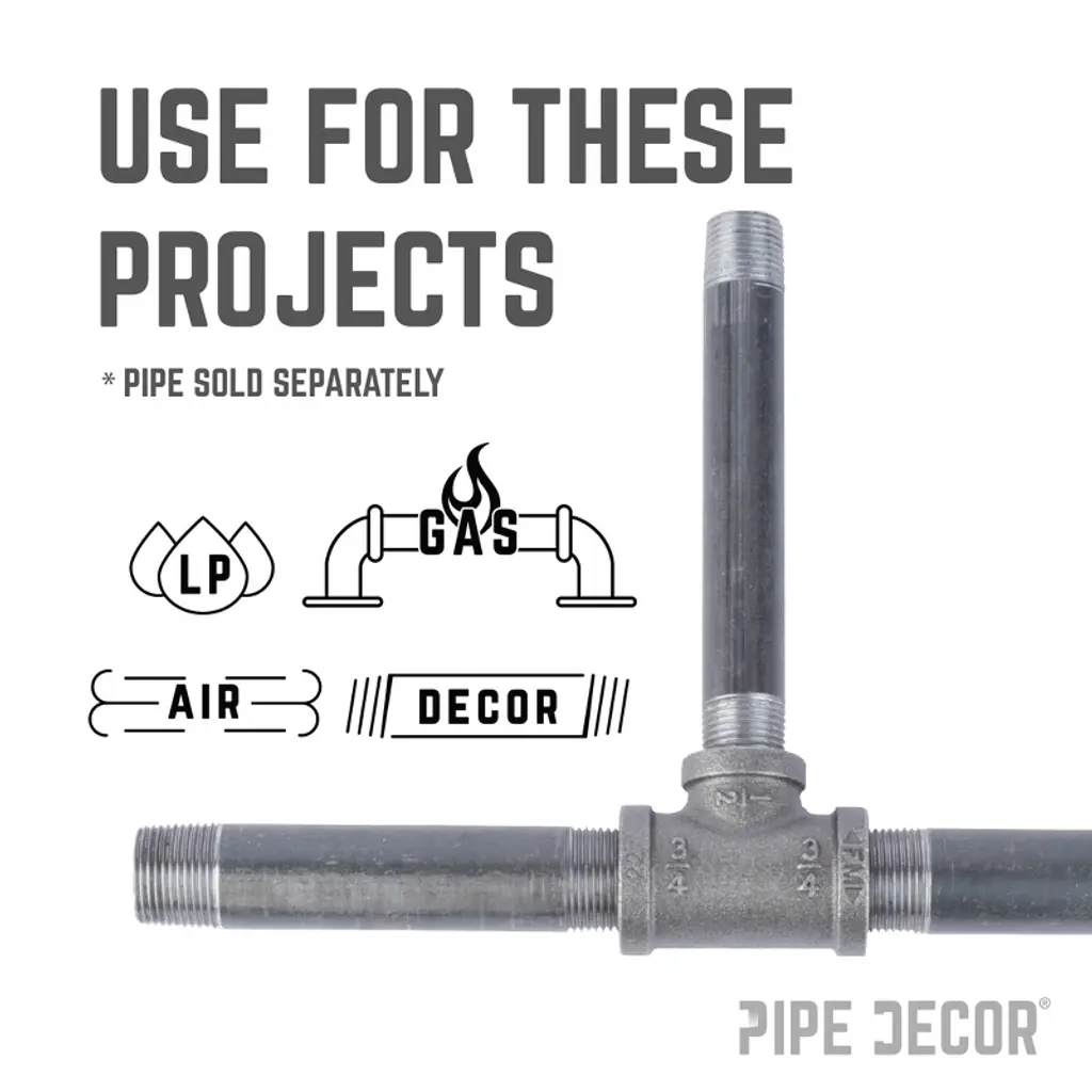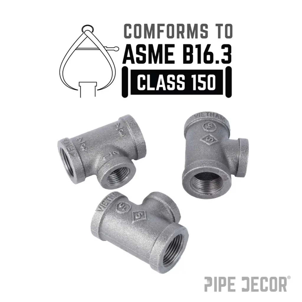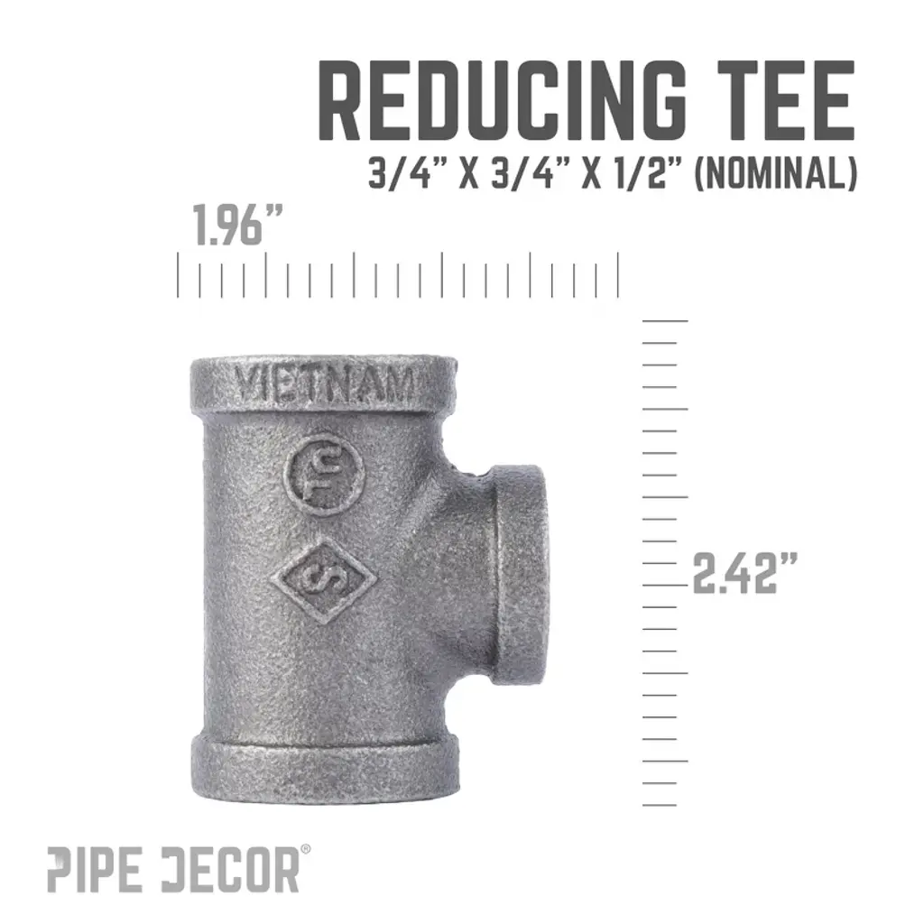Reducing Tees give you the flexibility to build whatever you dream of. Use them to create large pipe legs with smaller cross bars or to make bigger flange feet with smaller bars. At PIPE DECOR, we use them to add smaller cross bars and stability to larger pipe kits. Our fittings are made from cast iron, machined to specification, and hydrostatically tested to hold pressure. Black pipe and fittings can be used for gas, air, liquid petroleum, and home décor projects. Each fitting is coated in a light grease to prevent rust, and for home décor use, you will need to clean and seal them. Reducing Tees are available in sizes ranging from 2 inches down to 1/8 inch.