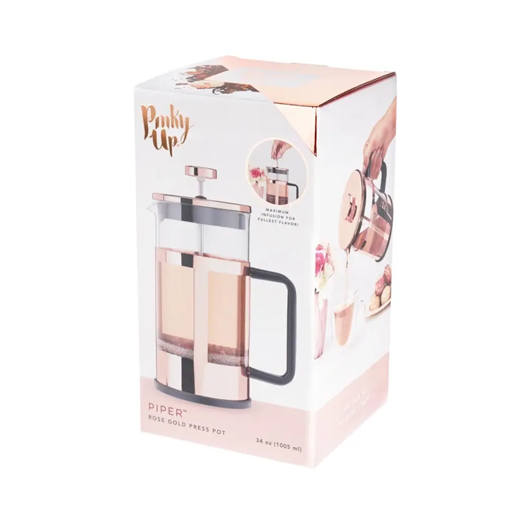French style and press! This 34 oz. gold french press has a gold-plated stainless steel frame to serve the hottest drinks while staying cool to the touch.
