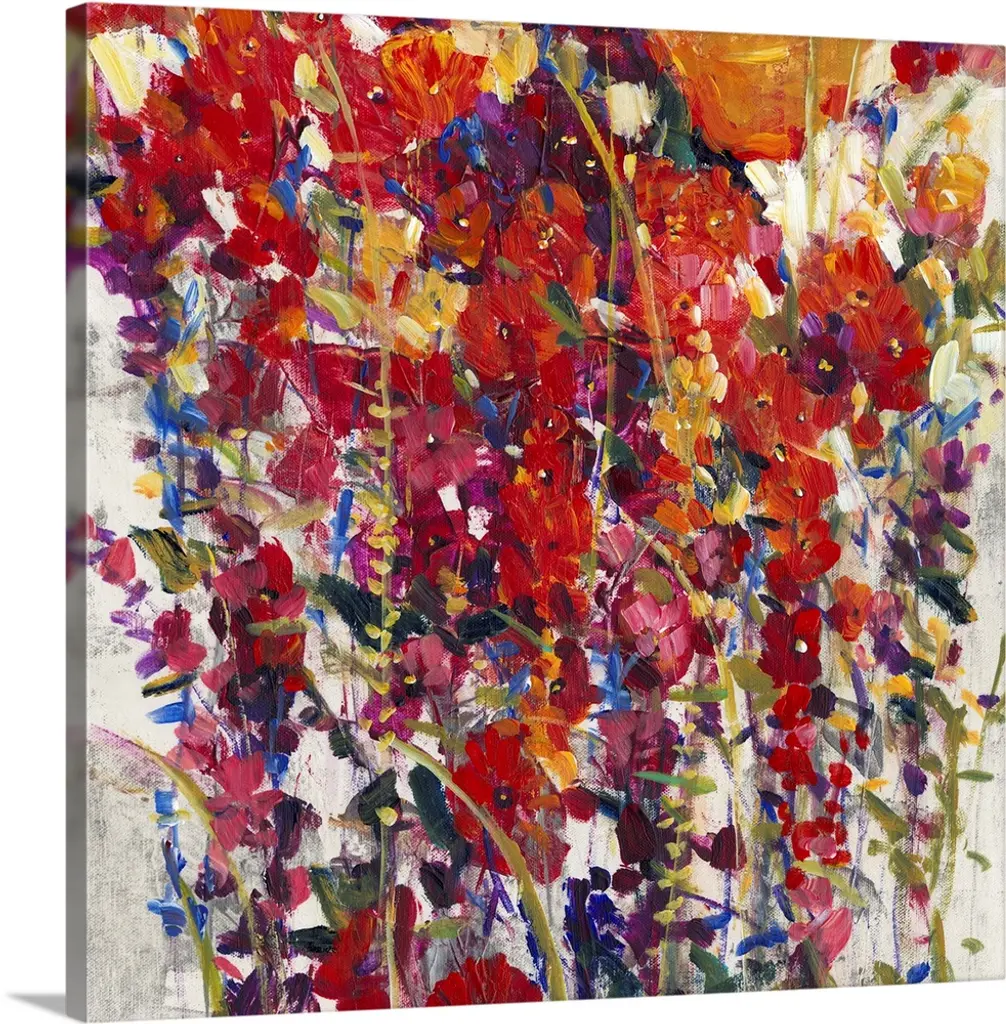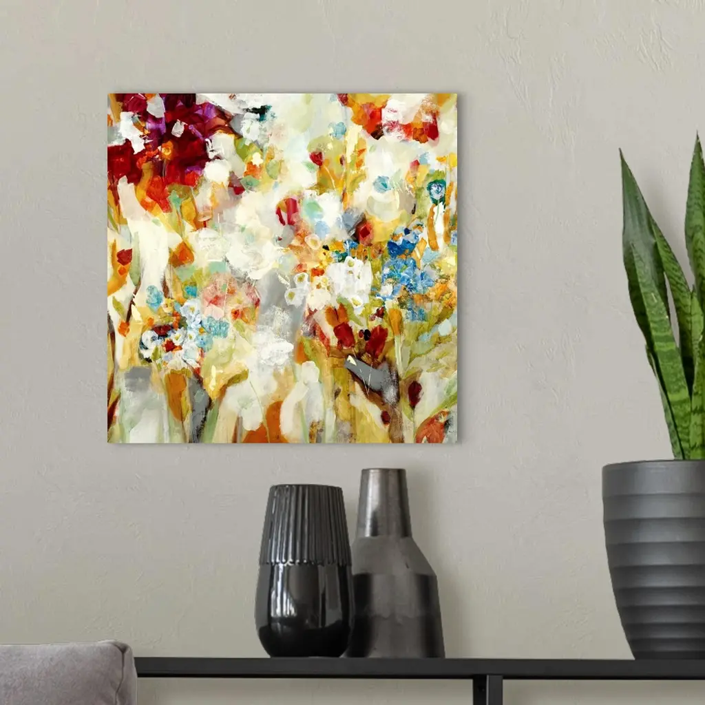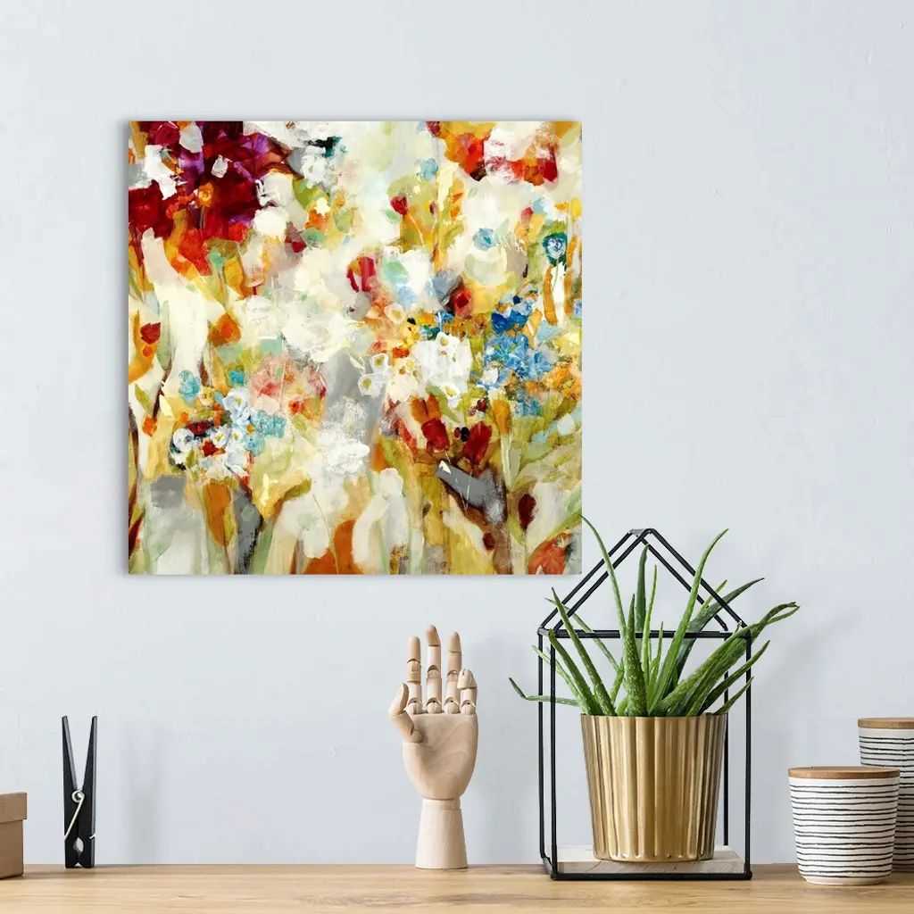 An abstract piece that has a variety of colors painted loosely to resemble flowers.