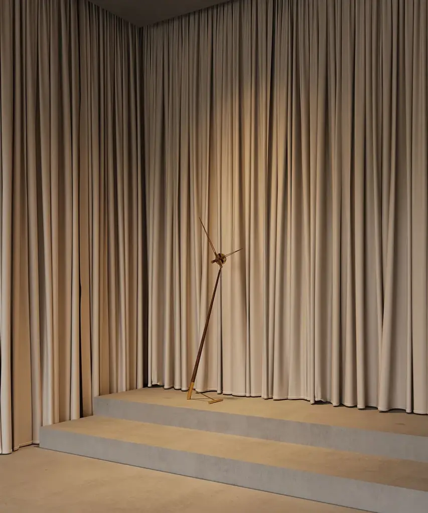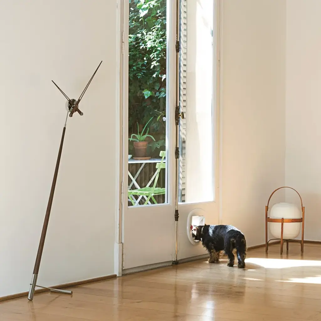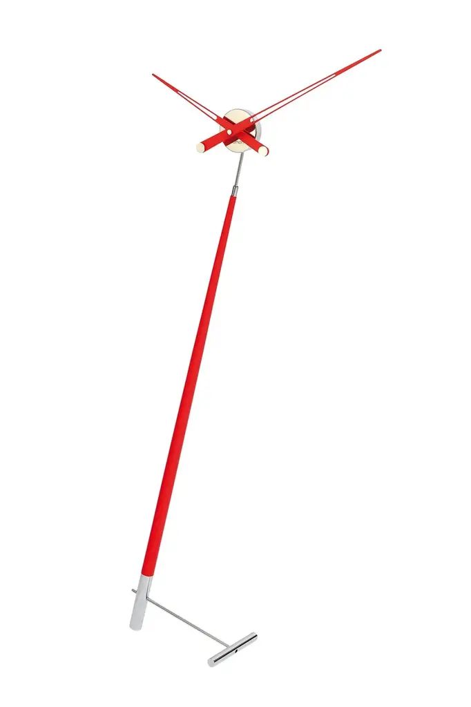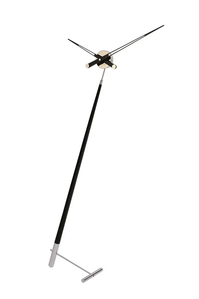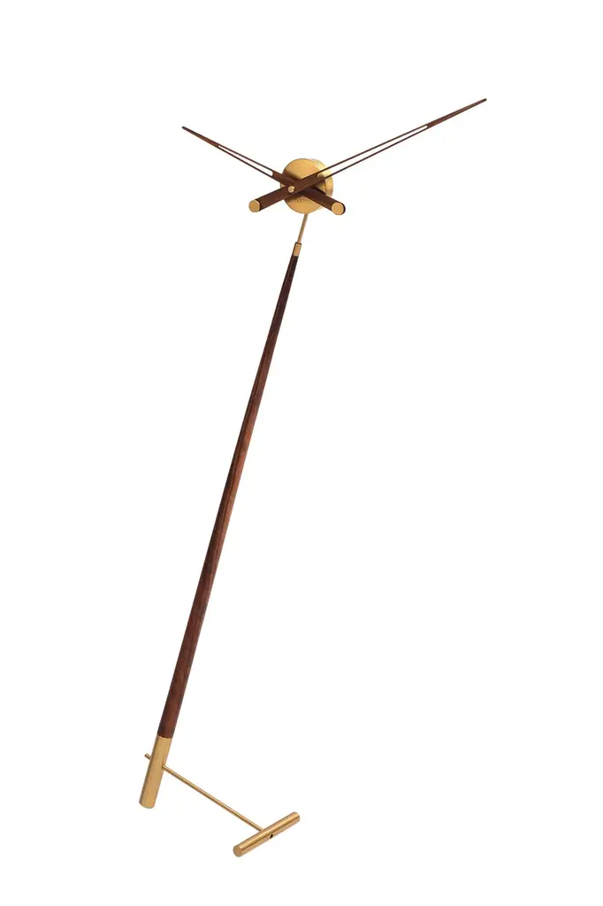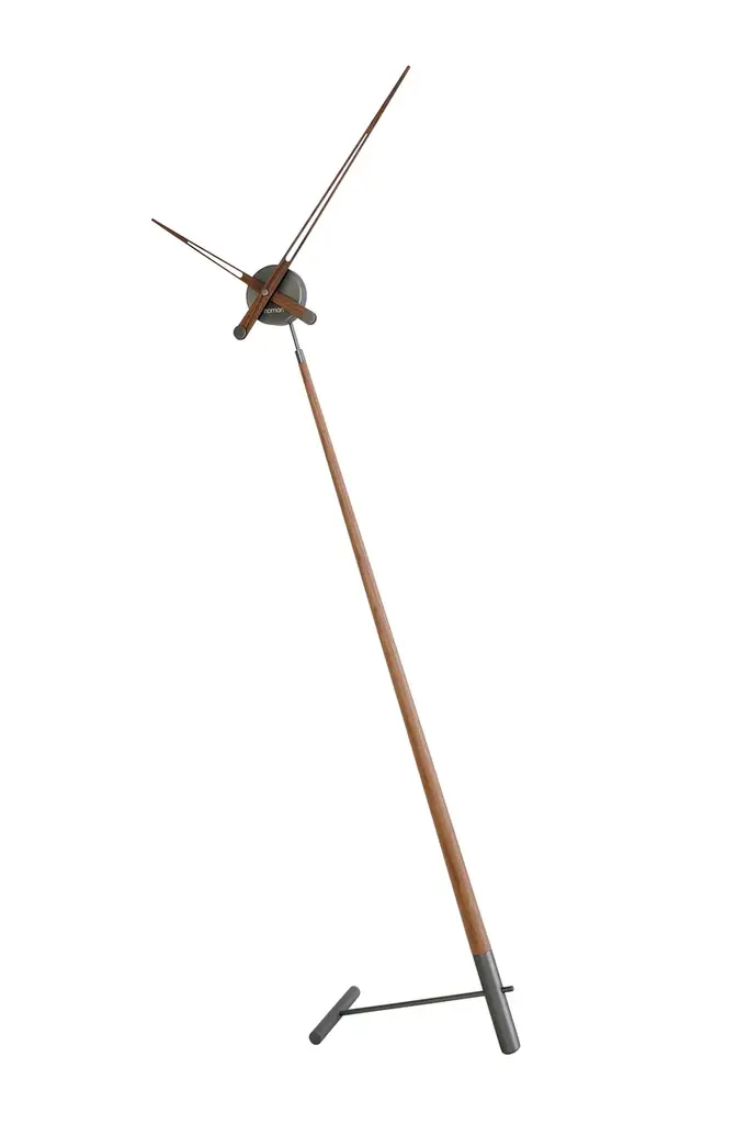 PISA is a wooden and brass clock. Its 150cm height makes it practically a piece of furniture. It rises from the ground with a stylized body of solid wood, creating a slight diagonal direction. It is crowned by two large walnut hands that overfly the space. PISA N (PIN):Box: Chromed brassHands: Solid walnut or wenge woodPISA G (PIDN):Box: Polished brassHands: Solid walnut or wenge woodPISA T (PITN):Box: Graphite brass finishHands: Solid walnut or wenge woodPISA L (PIL000N):Box: Chromed brassHands: Black, white or red lacquered walnut wood