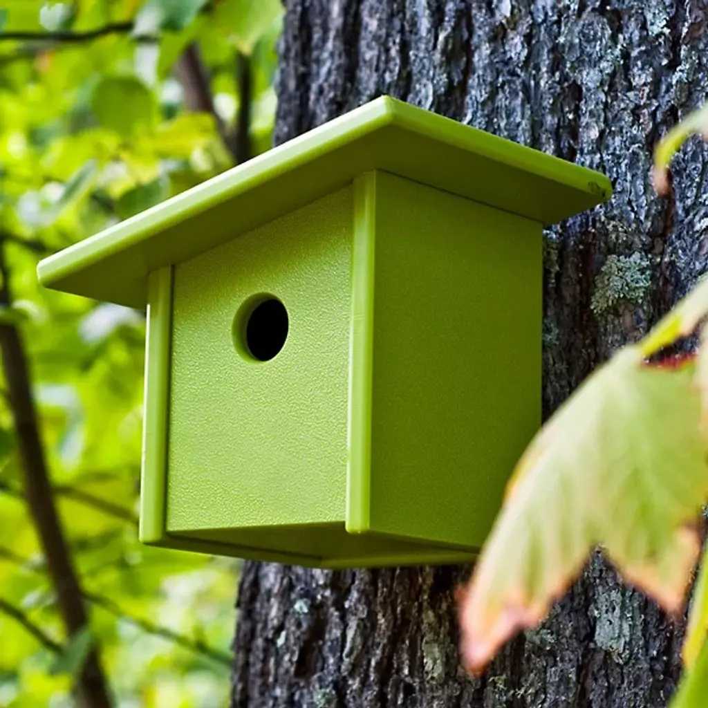 Designed by humans with birds in mind. The simple architectural design of the Loll Designs Pitch Birdhouse includes a sharply pitched roof and sleek living quarters. The entire structure slides on and off a fixed mounting plate for easy cleaning. Available in a range of colors of recycled HDPE (mostly from recycled milk jugs).