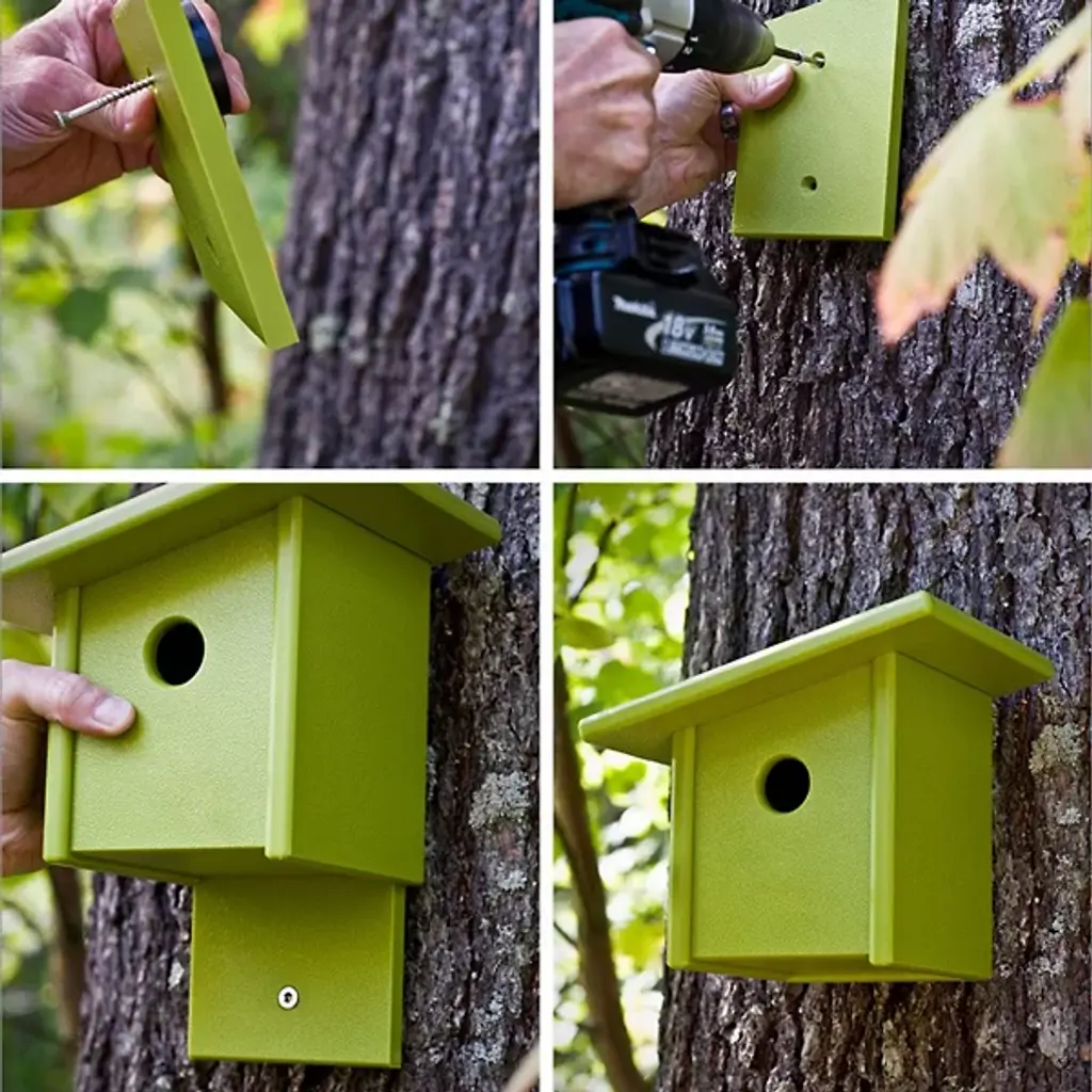 Designed by humans with birds in mind. The simple architectural design of the Loll Designs Pitch Birdhouse includes a sharply pitched roof and sleek living quarters. The entire structure slides on and off a fixed mounting plate for easy cleaning. Available in a range of colors of recycled HDPE (mostly from recycled milk jugs).