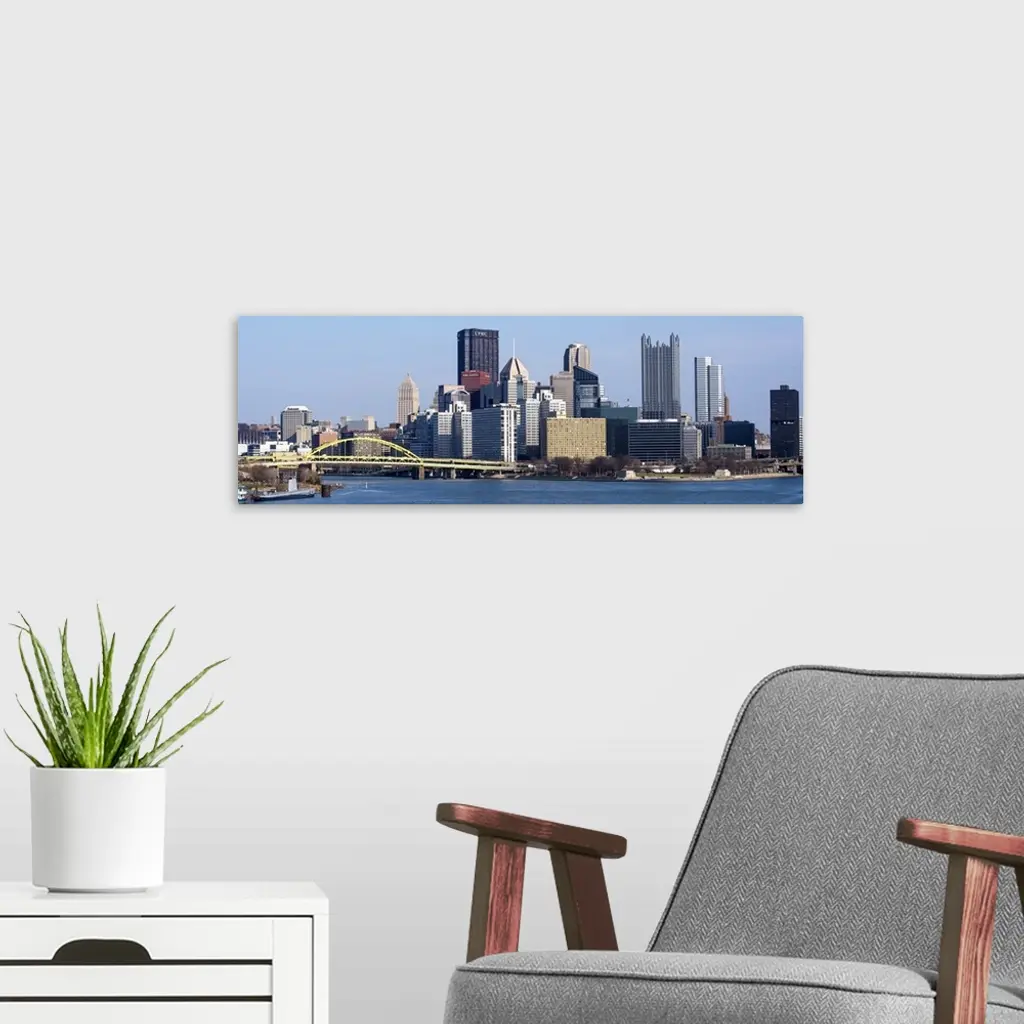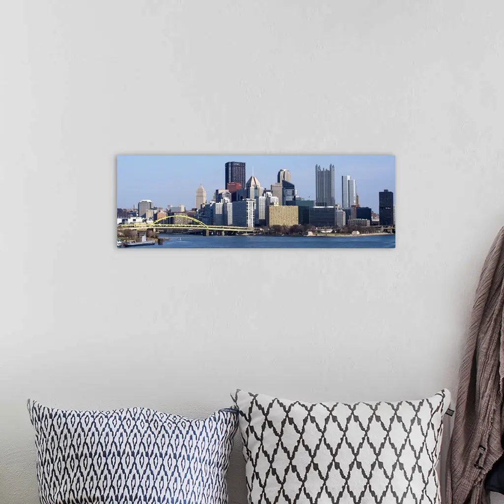 Skyline of Pittsburgh, Pennsylvania, with the Fort Pitt Bridge leading into the city.