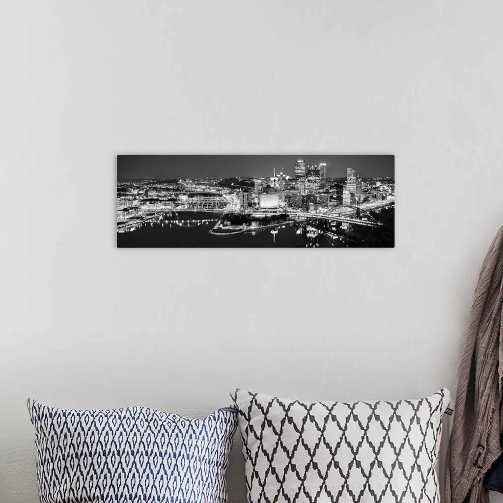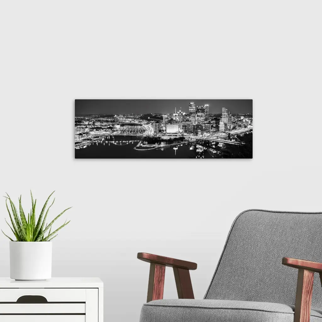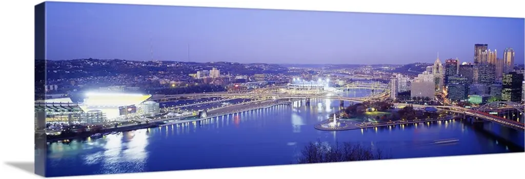 Panoramic photo of the city of Pittsburgh illuminated at night, with Point State Park in the foreground.