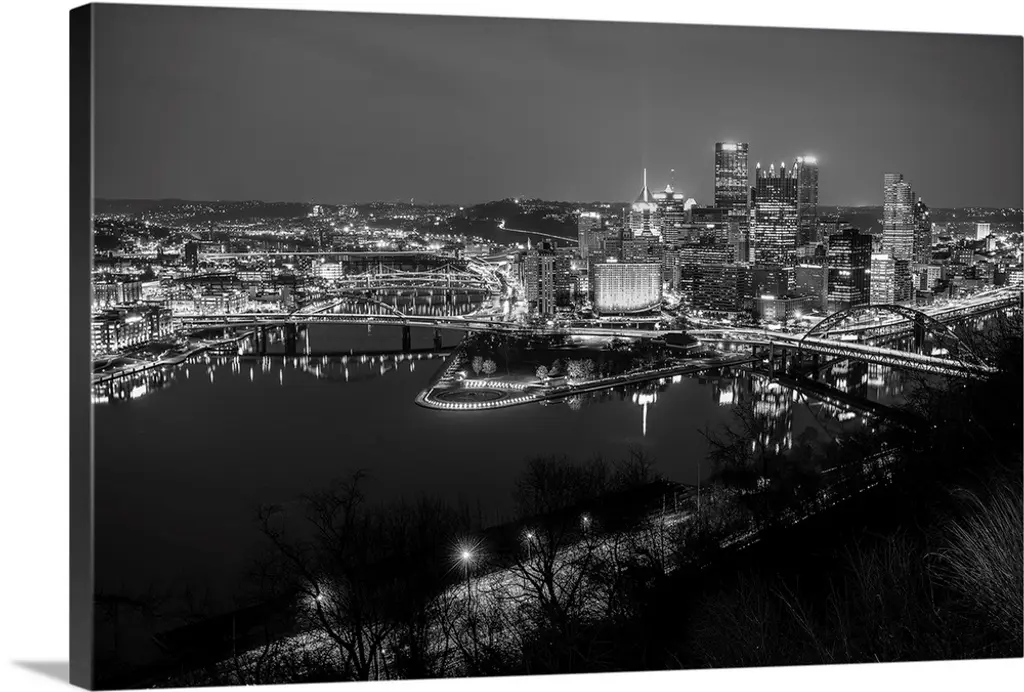 Skyscrapers and bridges in Pittsburgh, Pennsylvania, at nightfall.