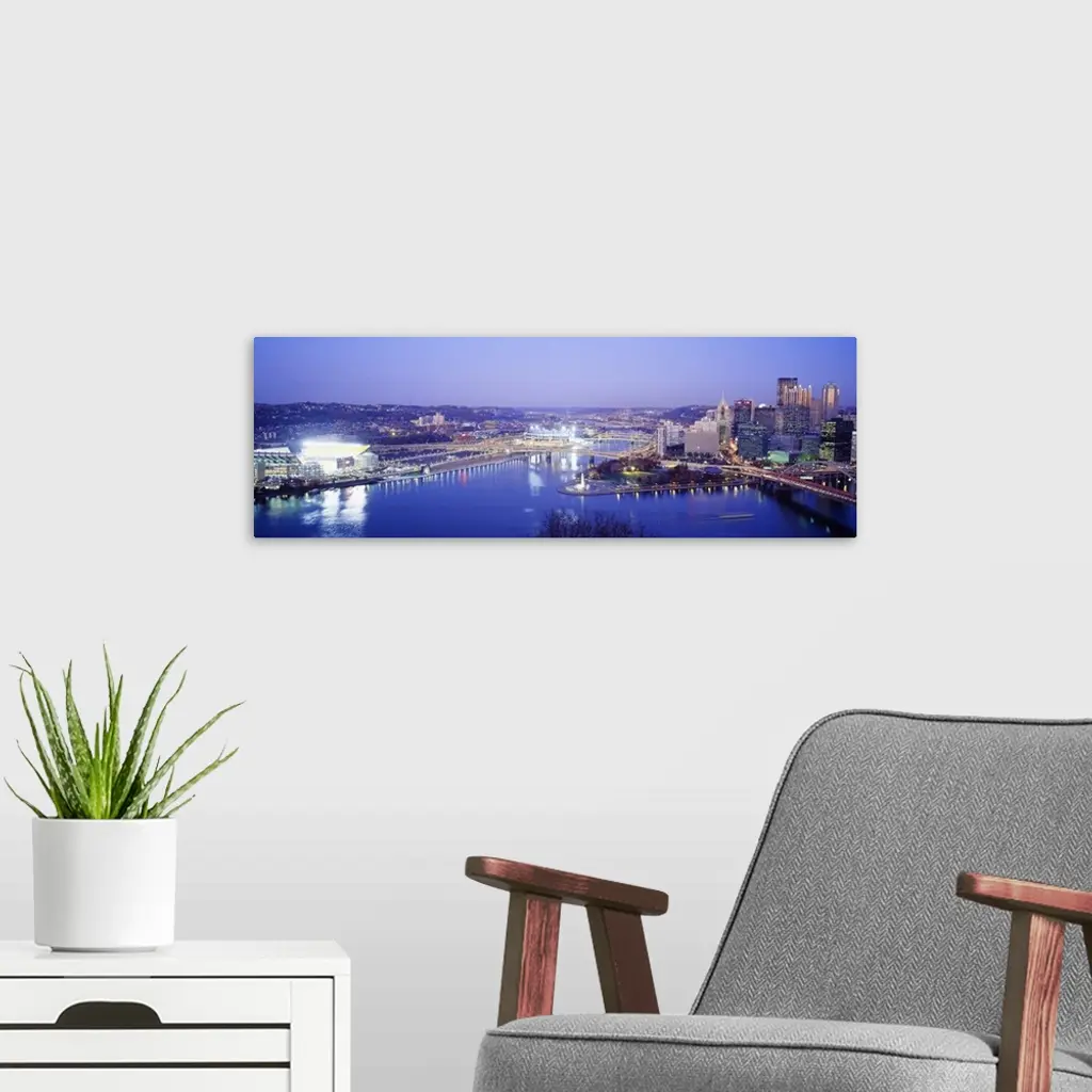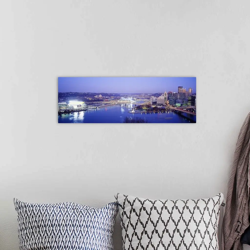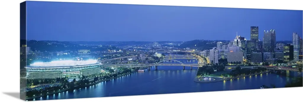 Panoramic photograph displays an aerial view overlooking the busy skyline of a city within the Northeastern United States as it sits next to the Ohio and Allegheny Rivers. Located on the left hand side of this photo is Heinz Field, home to the Pittsburgh Steelers of the National Football League. Photographer uses a slow shutter speed to get the fast moving effect on the boats and cars in the picture.