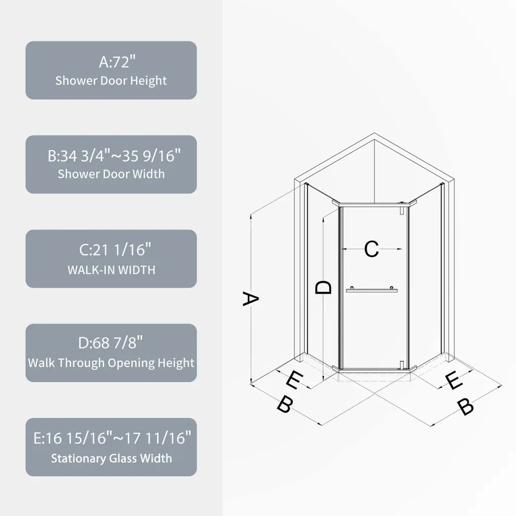 【Product Features】 ★Alu wall channel with quality #304 stainless steel handle, with 36000 times open and close test. ★SGCC 1/4" tempered clear glass ★Smooth and comfortable pivot system ★Good anti-leakage function. ★Stainless steel support bar 【Description】 [Pivot shower door] Size 34.75"x34.75"x72" 1/4" tempered clear glass Stainless steel handle 17.72". Fit for left open or Right open install. Fit for shower pan or floor installation. 【This product is fragile, if there is any damage when you receive the goods, please take a photo and contact us, so that we can quickly verify and deal with you】 【Notes】 1.Size Notice:Manual measurement has been used, there may be some reasonable errort, thanks for your understanding. 2.Color Notice:Due to factors such as display equipment and shooting environment, the color of the item may be slightly different from the picture, which is a normal phenomenon, please refer to the actual item 3.Assembly Notice:Please read assemble manual in advance. Please do not over-tighten nuts, as this may cause distortion or breakage. 4.It is recommended to put a layer of foam or soft cushion on the floor when installing to avoid scratching the floor. 5.If the item has any defects, damage or missing parts, please contact us with pictures or videos so that we can understand your needs and help you quickly, and always remember to retain its original packaging to ensure any return requests. We will try our best to solve any problems you may have. 6.If you receive the wrong product, please attach the product picture, the infographic of the outer package and the picture containing SKUs, so that we can verify and quickly deal with it for you