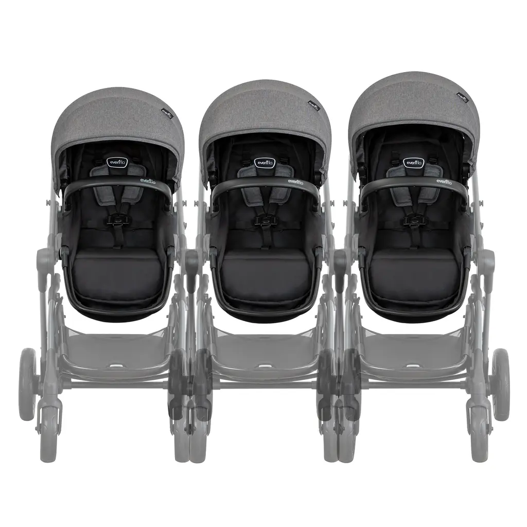 The Evenflo® Pivot Xpand™ Stroller Second Seat is the perfect addition for your growing family! The seat easily and quickly attaches with no tools or adapters. On your stroller, simply slide the main seat attachment up to create extra space and flip out the front seat attachment to click your second seat into place. Two children can now ride at once. For babies, the second seat effortlessly transforms to carriage mode, so your baby can lie flat and stretch out. The seat easily clicks onto the attachments in both parent- and forward-facing modes, giving you multiple riding configurations. The canopy can be adjusted to one of three heights as your child grows. The canopy shields your precious cargo from sun, wind and rain, while the peek-a-boo window allows you to keep an eye on your baby at all times. And the canopy can be adjusted to one of 3 heights to accommodate your growing child. As your family grows, so can your stroller! The seat can recline into 3 different positions with an easy one-handed tilt, while the footrest can be adjusted to any one of 6 positions.The toddler seat fits children up to 55 lb and 43 in. The seat comes with a 5-point harness and a detachable bumper bar, making it a breeze to get your child in and out of the seat. Compatible with the Evenflo Stroller Child Snack Tray with Snack Cup (sold separately). Compatible with the Pivot Xpand Travel System and Pivot Xpand Standalone Stroller. It's been 100 years and Evenflo continues to push the boundaries in baby and children's gear design and innovation. We meet the needs of new generations of parents by focusing on what they really care about: leading-edge safety, smart design and technology, and convenient features that help them enjoy the journey of parenthood. Features: