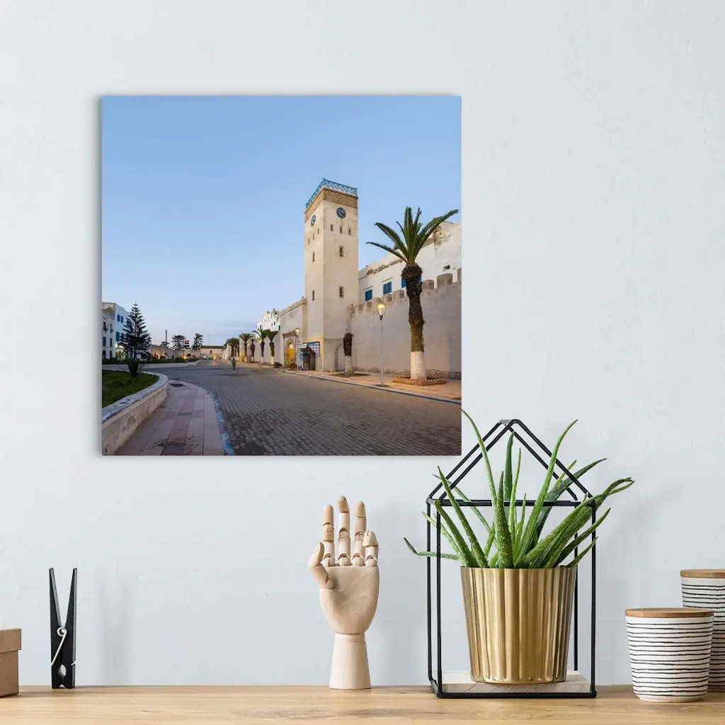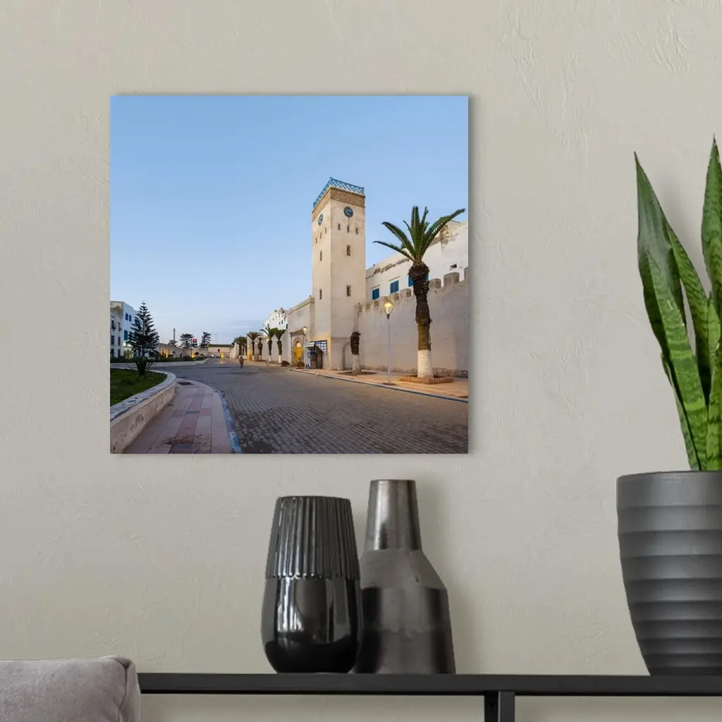 Morocco, Marrakesh-Safi (Marrakesh-Tensift-El Haouz) region, Essaouira. Place d'Horloge, clocktower and buildings in medina (old town).