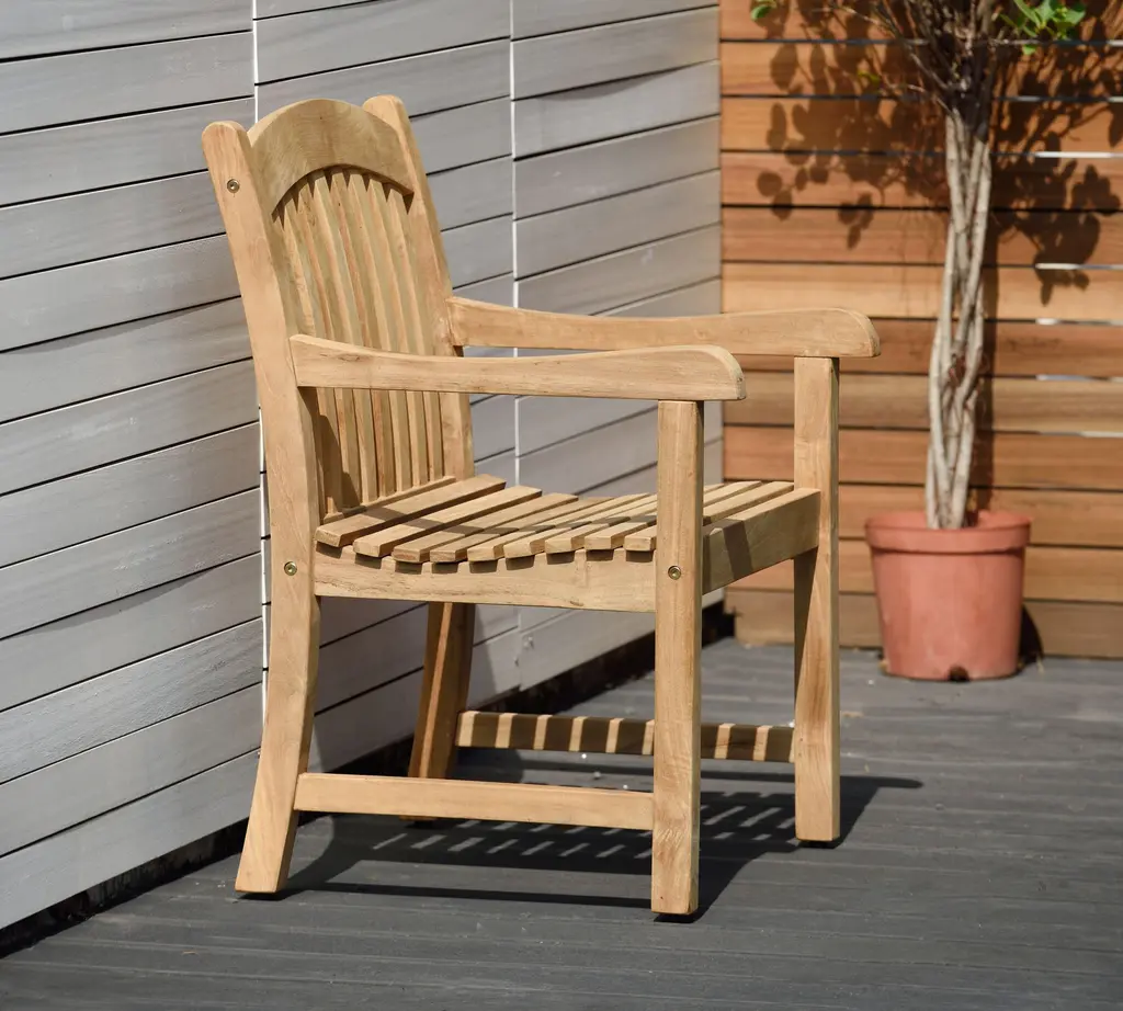 From dinners under the stars to casual backyard barbecues, the Placid Teak Dining Armchair is crafted to last. Teak wood has naturally water-resistant oils and a better-with-age patina, making it the most sought-after wood for outdoor furniture.
