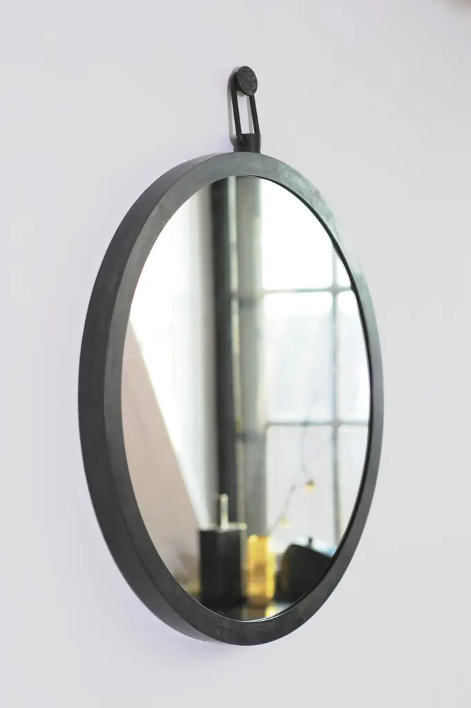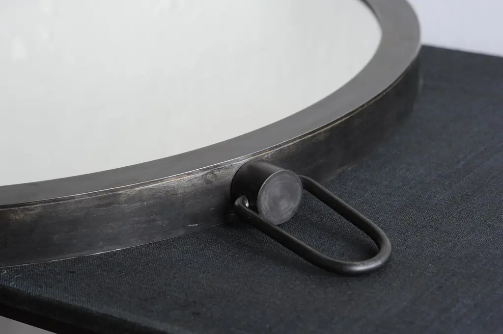 “Plain” mirror by Lukasz Friedrich.Dimensions: D 65 cm.Materials: Steel, mirror.Also available in black patina on steel, stainless steel, dimensions can be customized.Comes with wall fixation.Lukasz Friedrich (born 1980), lives and works in Warsaw. He is a self-taughtdesigner and craftsman. Lukasz grew up in and around gloomy and dusty metal workshop of his grandfather and father. In this family run manufacture he first met and got acquainted with accidental, not intended beauty of purely technical environment. Fascinating lathe machines and heavy pneumatic hammers not to mention poetic and almost ancient framesaw were his first objects of fascination. Once playground this old, no longer existing workshop later became his source of inspiration.Academic studies in social science with focus on cultural anthropology gave him professional insight into artifacts of human creation. During extensive fieldwork he once again fell in love with things small and omitted but visually very appealing. After getting his MA in Cultural Anthropology he entered family workshop as a co-worker. During years spent at working table manufacturing commissioned pieces, Lukasz was developing his own craft. Skills he gained allow him to hand make mostly every design he intends.He still gets his inspiration from technical surrounding. Very often possibilities and limitations given by materials become questions seeking answer. He likes his items raw but undoubtedly finished. Elegance and sophistication may be enclosed in the most simple shapes of often almost ordinary objects.