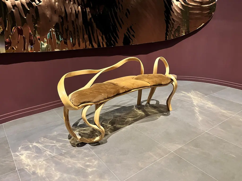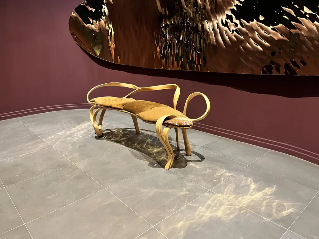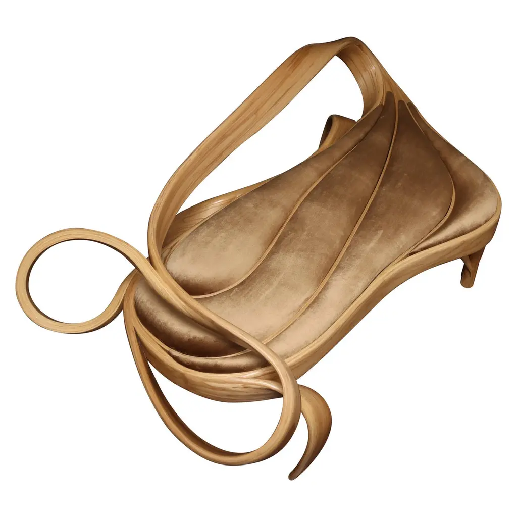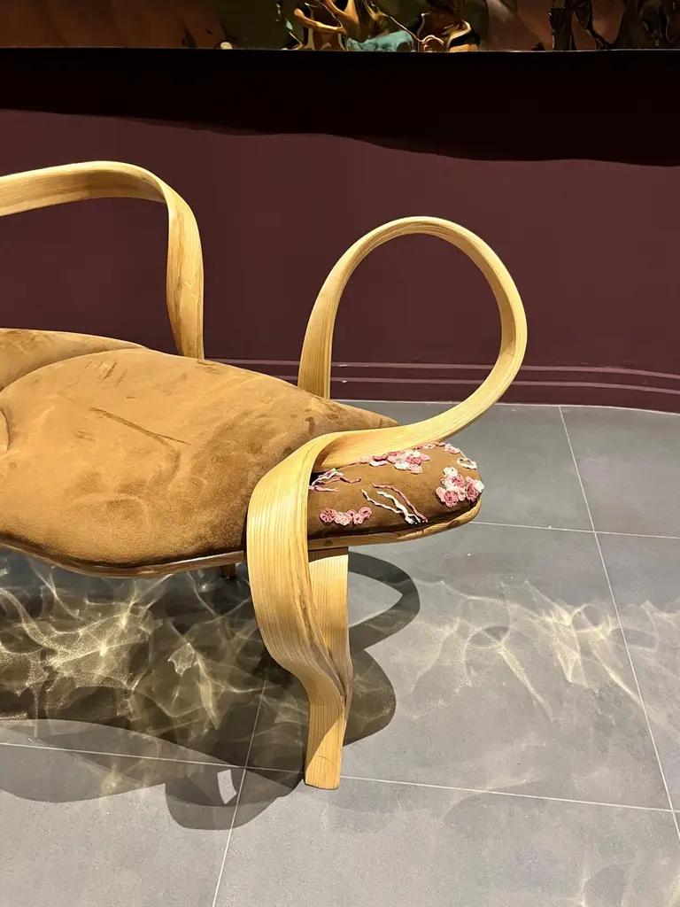 AboutPlana II - A lounge chassis designed and crafted by Raka Studio, is a part of the new collection, in which the studio has integrated a plain wooden surface. In this case, the plain surface is the seating area, which has been surrounded by organic design, made from the same material but with a totally different technique thus achieving and displaying the versatility of the studio's primary material of expression; Wood.The sculptural object is fully functional and comes with a soft velvet cushion covering the seating area. The colour of the wood and velvet are customizable.Raka Studio.