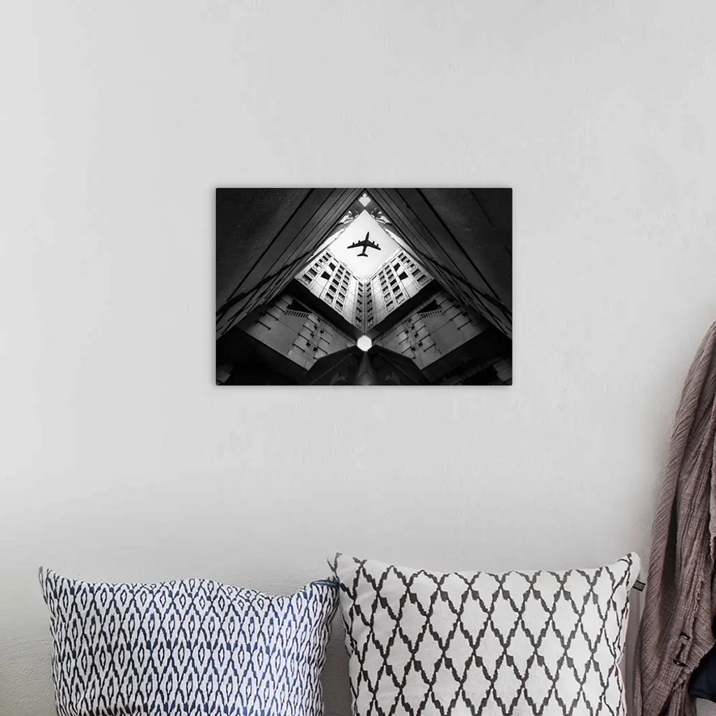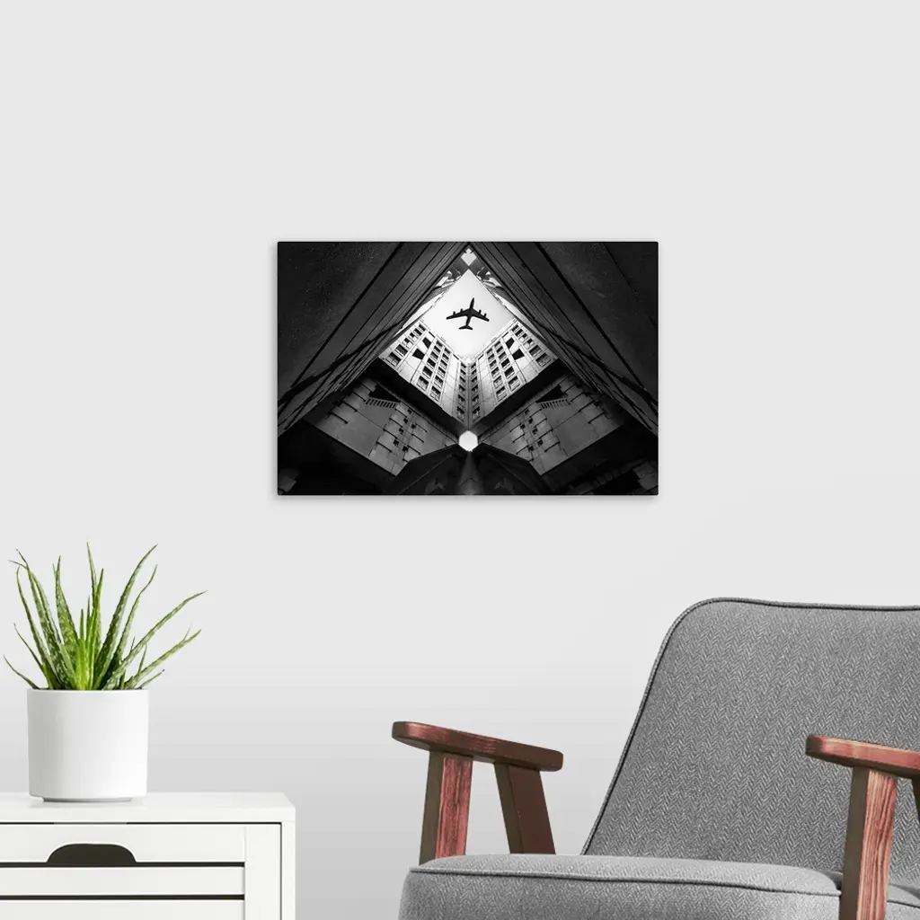 Looking up through the courtyard of a building to see an airplane flying above.