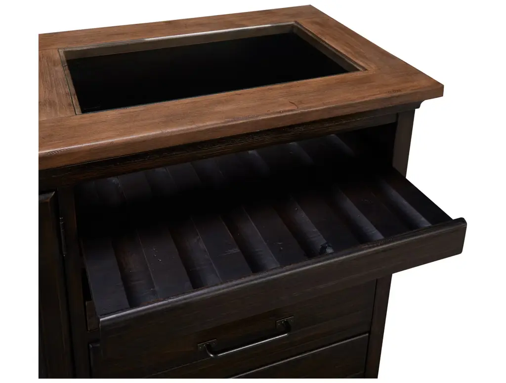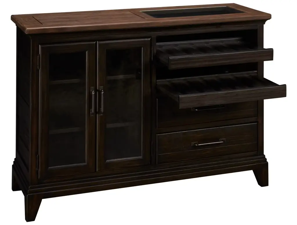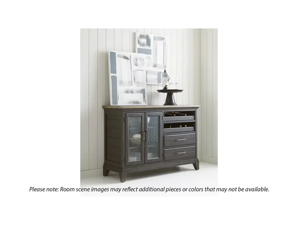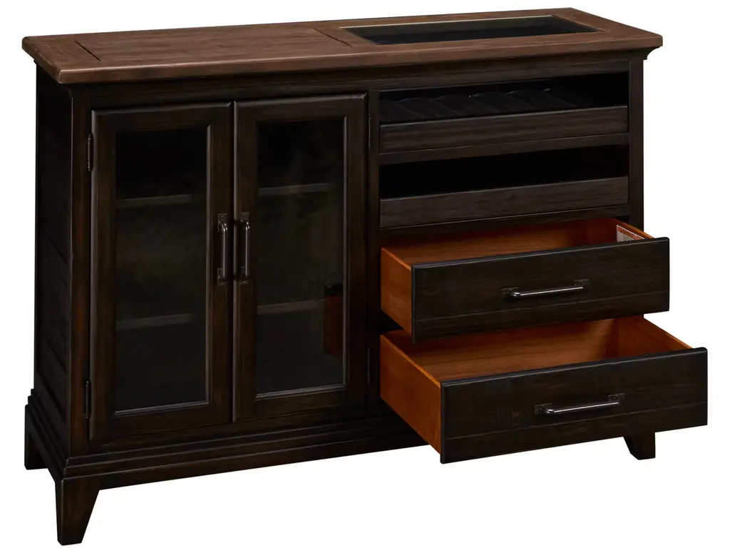 The Pleasant Hill server by Kincaid features equal parts storage and display and is completely functional. Two wine bottle trays are visible under a clear glass top while seeded glass doors conceal two adjustable shelves. It also includes two full-depth drawers. Finished in charcoal with a contrasting stone topper.