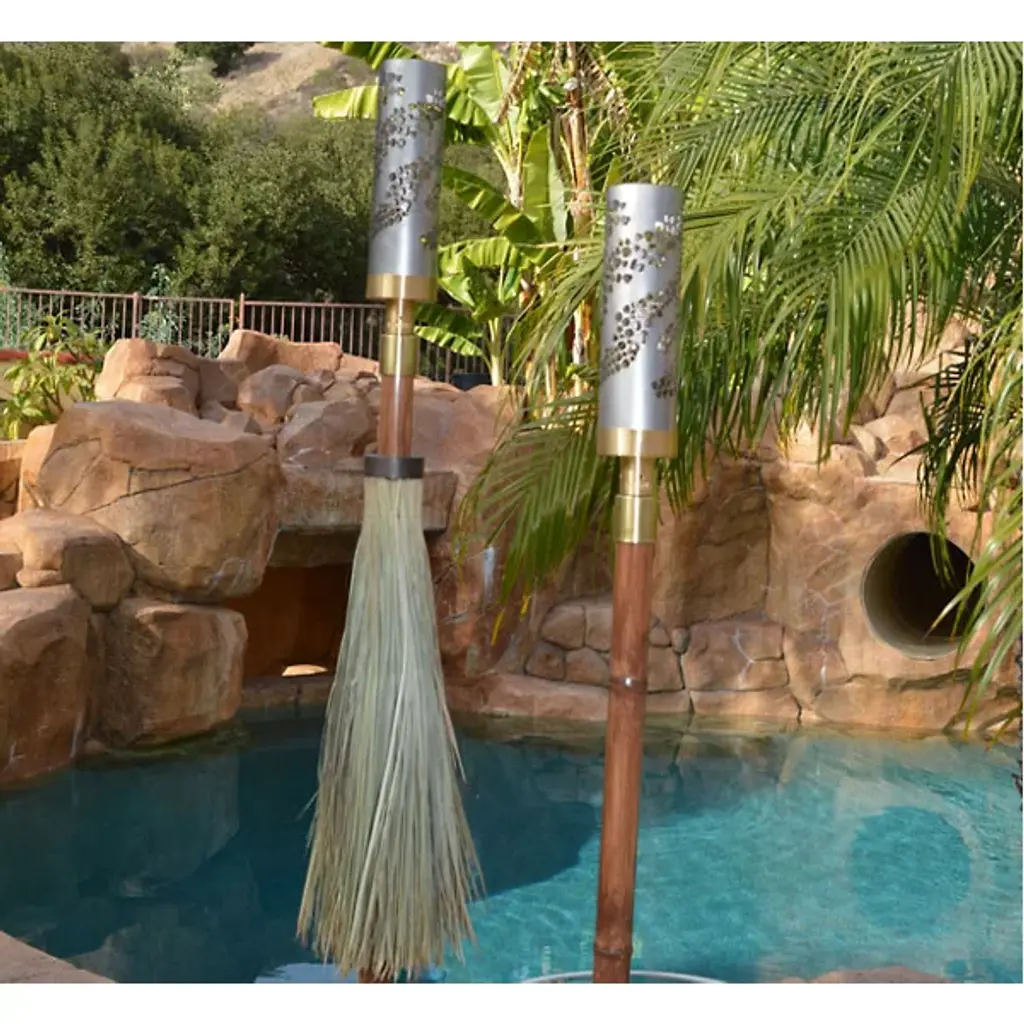 A festive, tropical addition to your outdoor walkways and patio areas. The Focus Industries Plasma Cut Natural Gas or Propane Tiki Torch illuminates with the pleasant, hypnotic brilliance of a flame embodied in perforated plasma cut designs. Its stem, supplied by installers, acts as a supply-feed and is topped with a cast brass head, a cast brass pipe adapter, and a stainless steel perforated flame screen. Professional help is required to make piping and gas line connections, and an extended lighter is needed for manual ignition. Tiki Skirt available separately.