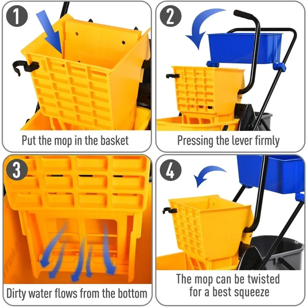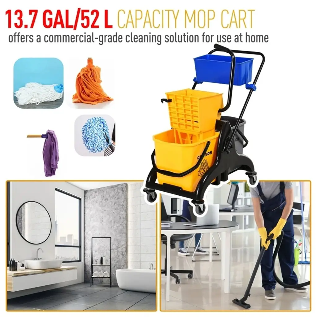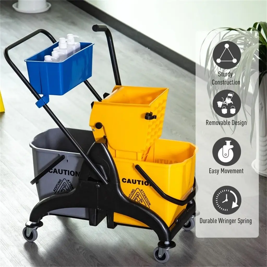 Specification: Key Features: Description: This 55 Quart Cleaning Bucket with Dual Buckets offers a practical solution for both home and commercial use. Featuring a durable PP plastic and metal design, it includes a side press wringer for efficient moisture wring-out and a water-separation system to keep clean and dirty water separate. The 27.5 Quart capacity in each bucket is perfect for tackling large cleaning tasks. The four quiet, non-marking casters make it easy to move, while the rugged build ensures long-lasting performance. Ideal for janitorial work, this cleaning bucket provides reliable and efficient cleaning support.