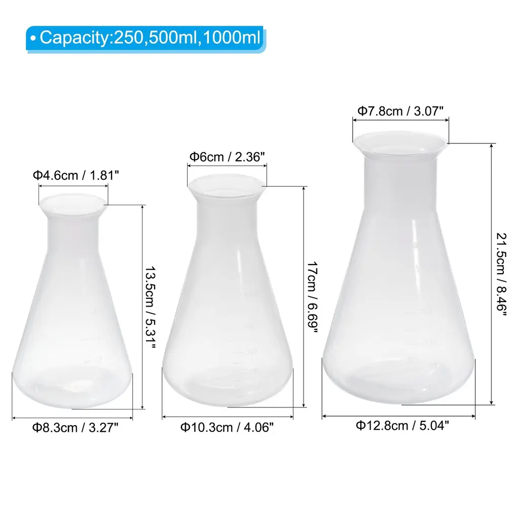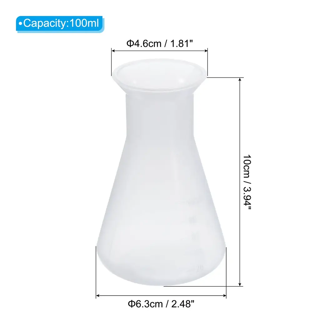 Our Erlenmeyer flasks are essential tools for various lab settings and experiments. They are perfect for measuring and storing liquids or chemicals, as well as for performing reaction processes such as titration. Their unique shape and design make them suitable for mixing and swirling substances.SpecificationMaterial: PlasticColor: ClearCapacity:50mlTotal Size: 5.1 x 8.1cm / 2.01 x 3.19 inch (D*H)Mouth Dia.: 3.8cm / 1.5 inchPackage List: 1 x Plastic Erlenmeyer FlaskAdvantageMade from plastic material that is durable, lightweight, and easy to handle. The flasks feature clear graduations for accurate volume measurement. InstructionThe Erlenmeyer flasks have a conical shape that provides excellent mixing and swirling capabilities. They have a wide base design that offers added stability and ease of handling. The clear graduations on the side make it easy to measure accurate volumes of liquids or chemicals.NoticeAlways avoid exposing them to extreme temperatures or harsh chemicals that may cause deformation or discoloration. Clean them thoroughly after each use and store them properly in a safe place.